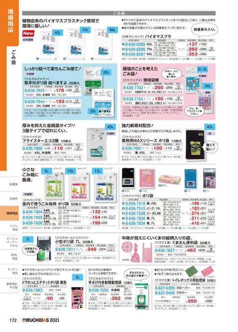 ●サトウキビ由来のバイオマスプラスチックを10%配合しており、二酸化炭素を約6%削減できます。●袋の容量が印刷されている容量表示入りポリ袋です。容量表示入り。税抜価格税込価格¥137¥150¥262¥288¥353¥388単位1袋(10枚入)M価税抜オープン商品種別寸法/650横)×800(縦)×0.02厚)mm、型式/HT4V寸法/800横)×900(縦)×0.025厚)mm、型式/HT7V寸法/900横)×1000(縦)×0.025厚)mm、型式/HT9V45L70L90Lお申込番号8-636-82858-636-82868-636-8287●●●[日本サニパック]バイオマスプラ●色/白半透明●材質/高密度ポリエチレン●包装数:1/60(●❶)、1/40(❷)、1/30(❸)20L環境のことを考えたごみ袋![ジャパックス]環境袋策分別ペールに適した強い素材。お申込番号M価税抜8-636-7703オープン税抜価格¥260税込価格¥286単位1袋(20枚入)商品種別半透明(KT35)、30〜35L、20枚入型式/45216842133588-636-7704オープン¥180¥1981袋(10枚入)商品種別透明(LR33)、30L、10枚入型式/4521684213334●寸法/半透明:620(横)×700縦)×0.02厚)mm、透明:500(横)×700(縦)×0.03(厚)mm●材質/半透明:高密度ポリエチレン、透明:再生原料+リニアポリエチレン●包装数:1/3045L半透明強力新素材配合!焼却しても塩化水素などの有害ガスが発生しません。[ジャパックス]業務用MAXシリーズポリ袋10枚入お申込番号M価税抜8-636-7607オープン商品種別黒、45L税抜価格¥100型式/S-52税込価格¥110単位1袋(10枚入)30〜35L半透明30L透明びん・缶・プラスチック系ごみに。45L黒薄くて強い!●●●しっかり結べて楽ちんごみ捨て!半透明[ケミカルジャパン]取手付ポリ袋結べますよ20枚入お申込番号M価税抜8-636-7643オープン税抜価格税込価格¥178¥195単位1袋(20枚入)商品種別20L、半透明型式/HK-20N8-636-7644オープン¥193¥2121袋(20枚入)商品種別30L、半透明型式/HK-30N●寸法/20L:500(横)×600縦)×0.02(厚)mm、30L:500(横)×700(縦)×0.02厚)mm●材質/高密度ポリエチレン●包装数:1/2030L厚みを抑えた省資源タイプ!!3層タイプで切れにくい。[ジャパックス]プライスターエコ3層10枚入お申込番号8-636-7889M価税抜¥120税抜価格¥110税込価格¥121単位1袋(10枚入)ごみ袋植物由来のバイオマスプラスチック使用で環境に優しい!70L90L45L白半透明商品種別45L、半透明型式/PS48●寸法/650(横)×800(縦)×0.016(厚)mm●材質/ポリエチレン(複合3層高密度/リニア/高密度)●包装数:1/100Sサイズ5LMサイズ10LLサイズ15L小さなごみ箱に最適。半透明●寸法/650(横)×800(縦)×0.015(厚)mm●材質/高密度ポリエチレン●包装数:1/100●20L●10L[ジャパックス]ポリ袋●約5L●7L●7LM価税抜オープン税抜価格税込価格¥106¥116¥183¥201¥274¥301¥211¥232¥410¥451単位1パック(10枚入)1パック(20枚入)1パック(50枚入)1パック(200枚入)お申込番号商品種別8-636-7518黒、20L8-636-7515ピンク、10L8-636-75088-636-7836青、7L8-636-7834黒、7L寸法/520×600×0.03(厚)mm、型式/P-22寸法/450×500×0.02(厚)mm、型式/PR-20(厚)mm、型式/SS-06寸法/320×380×0.02(厚)mm、型式/P-06寸法/320×380×0.01(厚)mm、型式/R-07グレー、約5L目安)寸法/300×400×0.02●●●●●単位1パック(50枚入)[ジャパックス]室内で使うごみ箱用ポリ袋50枚入お申込番号Sサイズ、5L8-636-7604半透明、8-636-7605半透明、8-636-7606半透明、Mサイズ、10LLサイズ、15L商品種別寸法/350(横)×450縦)mm、型式/PR-101寸法/400(横)×500縦)mm、型式/PR-102寸法/450(横)×550縦)mm、型式/PR-103M価税抜オープン税抜価格税込価格¥132¥145¥154¥169¥190¥209●厚さ/0.010mm●材質/高密度ポリエチレン●包装数:1/60●材質/ポリエチレン●包装数:1/60(❹)、1/50❺、❼)、1/120(❻)、1/30(❽)中身が見えにくいくまの絵柄入りの袋。[アズマ工業]くまさん便利袋50枚入7L保健室でも大活躍。[ハウスホールドジャパン]小型ポリ袋7L50枚入お申込番号M価税抜8-636-7811オープン税抜価格¥240税込価格単位¥2641パック(50枚入)商品種別型式/GL-07●寸法/320×380×0.02厚)mm●材質/低密度ポリエチレン●包装数:1/60使用例●マチ付きショッピングバッグ型エチケットポリ袋!●黒い袋なので中が見えにくい。約1カ月分の新聞がスッキリと保管できます。手さげだから持ち運びが簡単!!5L[ジャパックス]トワれっとエチケットポリ袋黒色お申込番号8-636-7983単位M価税抜商品種別型式/SN06税抜価格¥90税込価格¥991パック(30枚入)オープン●寸法/300(横)(180+マチ120)×400(縦)mm●厚さ/0.013mm●材質/高密度ポリエチレン●包装数:1/60[ケミカルジャパン]手さげ付き新聞整理袋15枚入お申込番号8-636-7595単位M価税抜商品種別半透明税抜価格¥262型式/NP-15税込価格¥2881パック(15枚入)オープン●寸法/290(幅)×220(奥)×600(高)×0.03(厚)mm●材質/高密度ポリエチレン●包装数:1/60お申込番号M価税抜8-636-7827オープン税抜価格¥463税込価格¥509単位1個(50枚入)商品種別型式/752390000●使用時寸法/360×170(マチ100)mm●質量/2.4g●耐冷温度/-130℃●材質/ポリエチレン●包装数:1/60●捨てるとき中身が見えにくい。●1枚ずつ取り出せます。[アズマ工業]トイレボックス用処理袋50枚入クローバーフラワーお申込番号8-637-0399クローバー8-637-0400フラワー商品種別型式/752380100型式/752381100単位M価税抜1パック(50枚入)オープン税抜価格¥260税込価格¥286●寸法/約260(幅)×290(高)×0.015(厚)mm●材質/ポリエチレン●包装数:1/1