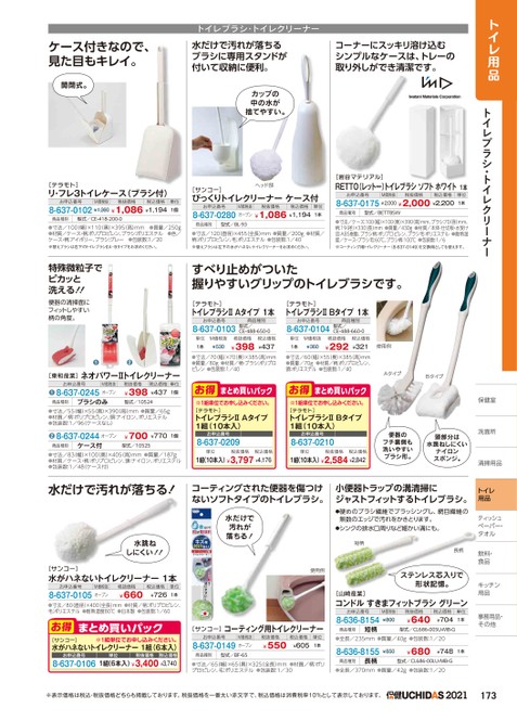 トイレ用品トイレブラシ・トイレクリーナー保健室室洗面所洗面所清掃用品トイレブラシ・トイレクリーナー水だけで汚れが落ちるブラシに専用スタンドが付いて収納に便利。コーナーにスッキリ溶け込むシンプルなケースは、トレーの取り外しができ清潔です。カップの中の水が捨てやすい。ヘッド部[サンコー]びっくりトイレクリーナーケース付お申込番号M価税抜税抜価格税込価格8-637-0280オープン¥1,086¥1,194単位1本商品種別型式/BL-93●寸法/120(直径)×455(全長)mm●質量/200g●材質/柄:ポリプロピレン、毛:ポリエステル●包装数:1/40※替えブラシは左下の水がハネないトイレクリーナーをお求めください。[岩谷マテリアル]RETTO(レットー)トイレブラシソフトホワイト1本お申込番号M価税抜税抜価格税込価格8-637-0175¥2,000¥2,000¥2,200単位1本商品種別型式/BETTBSW●寸法/ケース:100(幅)×100(奥)×390(高)mm、ブラシ:70径)mm、柄:19(径)×330(長)mm●質量/430g●材質/本体・仕切板・水受け皿:ABS樹脂、ブラシ柄:ポリプロピレン、ブラシ毛:ポリエステル●耐熱温度/ケース・ブラシ毛:60℃、ブラシ柄:100℃●包装数:1/6※コーティング用トイレクリーナー(8-637-0149)を交換用としても使えます。すべり止めがついた握りやすいグリップのトイレブラシです。[テラモト]トイレブラシⅡAタイプ1本お申込番号8-637-0103商品種別型式/CE-488-650-0[テラモト]トイレブラシⅡBタイプ1本お申込番号8-637-0104商品種別型式/CE-488-660-0単位M価税抜1本¥530税抜価格¥398税込価格¥437●寸法/70(幅)×70奥)×385(高)mm●質量/80g●材質/柄・ブラシ:ポリプロピレン●包装数:1/40単位M価税抜1本¥360税抜価格¥292税込価格¥321●寸法/60幅)×55(奥)×385(高)mm●質量/70g●材質/柄:ポリプロピレン、頭:ポリエステル●包装数:1/40お得まとめ買いパックお得まとめ買いパック※1組単位申込。※1組単位申込。[テラモト]トイレブラシⅡAタイプ1組(10本入)[テラモト]トイレブラシⅡBタイプ1組(10本入)お申込番号8-637-0209お申込番号8-637-0210単位税抜価格税込価格1組(10本入)¥3,797¥4,176単位税抜価格税込価格1組(10本入)¥2,584¥2,842使用例AタイプBタイプ便器のフチ裏側も洗いやすいブラシ形。頭部分は水跳ねしにくいナイロンスポンジ。コーティングされた便器を傷つけないソフトタイプのトイレブラシ。小便器トラップの溝清掃にジャストフィットするトイレブラシ。トイレ用品水だけで汚れが落ちる!●硬めのブラシ繊維でブラッシングし、網目繊維の無数のエッジで汚れをかきとります。●シンクの排水口周りなど細かい溝にも。短柄長柄使用例ステンレス芯入りで形状記憶。[山崎産業]コンドルすきまフィットブラシグリーン[サンコー]コーティング用トイレクリーナーお申込番号M価税抜8-637-0149オープン税抜価格¥550税込価格単位¥6051本商品種別型式/BF-65●寸法/65(幅)×65(奥)×325(全長)mm●材質/柄:ポリプロピレン、毛:ポリエステル●包装数:1/30お申込番号8-636-8154M価税抜¥800商品種別短柄税抜価格税込価格単位¥640¥704型式/CL686-00SU-MB-G1本●全長/235mm●質量/40g●包装数:1/208-636-8155¥850商品種別長柄¥680¥748型式/CL686-00LU-MB-G1本●全長/370mm●質量/42g●包装数:1/20ティッシュッペーパー・ペーパー・タオルタオル飲料・食品キッチンキッチン用品用品事務用品・事務用品・その他他ケース付きなので、見た目もキレイ。開閉式。[テラモト]リ・フレ3トイレケース(ブラシ付)お申込番号M価税抜税抜価格税込価格8-637-0102¥1,360¥1,086¥1,194単位1個商品種別型式/CE-418-200-0●寸法/100幅)×110(奥)×395(高)mm●質量/250g●材質/ケース・柄:ポリプロピレン、ブラシ:ポリエステル●色/ケース・柄:アイボリー、ブラシ:グレー●包装数:1/20※替えブラシは右下のトイレブラシⅡA・Bタイプをお求めください。特殊微粒子でピカッと洗える!!便器の清掃面にフィットしやすい柄の角度。●●[東和産業]ネオパワーⅡトイレクリーナーお申込番号M価税抜●8-637-0245オープン税抜価格税込価格¥398¥437単位1個商品種別ブラシのみ型式/10524●寸法/55(幅)×55(奥)×390(高)mm●質量/65g●材質/柄:ポリプロピレン、頭:ナイロン、ポリエステル●包装数:1/96(ケースなし)●8-637-0244オープン¥700¥7701個商品種別ケース付型式/10525●寸法/83(幅)×100(奥)×405(高)mm●質量/187g●材質/ケース・柄:ポリプロピレン、頭:ナイロン、ポリエステル●包装数:1/48(ケース付)水だけで汚れが落ちる!水跳ねしにくい!![サンコー]水がハネないトイレクリーナー1本お申込番号M価税抜8-637-0105オープン税抜価格¥660税込価格単位¥7261本●寸法/80(直径)×400(全長)mm●材質/柄:ポリプロピレン、毛:ポリエステル●耐熱温度80℃●日本製●包装数:1/60お得まとめ買いパック[サンコー]※1組単位申込。水がハネないトイレクリーナー1組(6本入)お申込番号8-637-0106単位税抜価格税込価格1組(6本入)¥3,400¥3,740※表示価格は税込・税抜価格どちらも掲載しております。税抜価格を一番太い赤文字で、税込価格は消費税率10%として表示しております。2021173