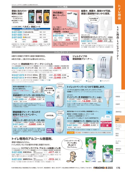 トイレ用品トイレ用品・トイレクリーナー※パッケージデザインは変更になる場合があります。便座に貼るだけ!簡単に吸着!●便座を立ててもズレ落ちません。●洗濯機でくり返し洗えます。ふわふわくもピンクオレンジ[小久保工業所]ペタポン便座シート在庫無次第終了商品商品種別お申込番号8-637-03838-637-03848-637-0420●ふわふわくも●ピンク●オレンジ型式/3501型式/3506型式/3509単位1組M価税抜¥215税抜価格¥200税込価格¥220●使用時寸法/98(幅)×380(長)×3厚)mm●質量/10g●材質/表面:ポリエステル100%、中間層:発泡ウレタン、裏面:ポリウレタン100%●包装数:1/120トイレ用品洋式便座に敷くペーパーです。縦置き、横置き、壁掛けが可能。便座に直接触れないから清潔。そのまま置けるボックス型。[丸ノ内紙工]非木材シートペーパー(便座用)100枚入お申込番号8-637-0189単位M価税抜商品種別型式/M-S100P税抜価格¥400税込価格¥4401パック(100枚入)オープン●シート寸法(1枚あたり)/372×432mm●質量/320g●材質/非木材(葦+パルプ)●四つ折り●包装数:1/50[サンナップ]箱のまま使えるトイレシートペーパー100枚入お申込番号M価税抜8-637-0416オープン税抜価格税込価格¥580¥638単位1箱(100枚入)商品種別型式/TSP-3WB●寸法/箱:200(幅)×40奥)×137(高)mm、ペーパー:432×372mm●質量/300g●材質/パルプ●四つ折り●包装数:1/60●カートリッジ800mL●カートリッジ400mL●ディスペンサー容量/400mL、型式/14634容量/800mL、型式/14638¥2,600¥2,135¥2,348¥4,300¥3,440¥3,7841個8-637-0379カートリッジ400mL8-637-0414カートリッジ800mL●●※便座除菌クリーナーのディスペンサーのみとなります。別売のカートリッジと合わせてお使いください。●成分/エタノール、カモミラエキス他●包装数:1/18●)、1/12(●)※クリーンジェルディスペンサーのカートリッジとなります。●優れた除菌力で素早く座面の雑菌を除去。●乾きが速く、2度ぶきの必要はありません。[アルボース]便座除菌クリーナークリーンジェルトイレクリーナージェルタイプの便座除菌クリーナー。お申込番号8-637-0378商品種別ディスペンサーのみ型式/33151M価税抜税抜価格税込価格¥4,000¥3,280¥3,608単位1個寸法/140(幅)×85(奥)×225(高)mm●質量/430g●お客様取付商品●包装数:1/12●●別売の便座除菌クリーナーを入れて押すだけ。※除菌クリーナーは付属しておりません。[サラヤ]便座除菌用ディスペンサーMD-300B-PHJお申込番号M価税抜税抜価格税込価格8-637-0289¥1,300¥1,234¥1,357単位1個便座除菌クリーナー用です。商品種別型式/41938●壁付け型●寸法/79(幅)×99(奥)×203(高)mm●容量250mL用●付属品/壁取付用両面テープ、ねじセット●お客様取付商品●包装数:1便座除菌クリーナーを入れて使用するディスペンサー。※除菌クリーナーは付属しておりません。[サラヤ]便座クリーナー用ディスペンサーSC-4601プッシュ0.3mL。カギ付き。お申込番号M価税抜税抜価格税込価格8-637-0423オープン¥3,600¥3,960単位1個商品種別型式/41849●寸法/100(幅)×80(奥)×230(高)mm●質量/310g●容量/450mL●付属品/薬液用ボトル(空)、鍵×1個、壁面取付用両面テープ、使用方法ラベル●お客様取付商品●包装数:11プッシュ0.8mL。トイレットペーパーにつけて使用します。いたずらの心配がなく交換しやすいディスポタイプです。対応機種MD-300B-PHJ、スクールデコ(MD-250JB・MD-250JG)用[サラヤ]ディスペンサー用便座除菌クリーナー24個入保健室室洗面所洗面所5L清掃用品お申込番号M価税抜税抜価格税込価格8-637-0220¥14,400¥14,000¥15,400単位1セット(24個入)●寸法/72幅)×60奥)×181高)mm●質量/290g●容量/250mL●成分/塩化ベンザルコニウム他●包装数:1※補充式ではありません。抵抗性の強いウイルスにも作用した便座除菌クリーナー。●便座への影響にも配慮した、エタノールを主成分とした便座除菌クリーナー。●トイレのドアノブ、水洗レバーなどにも使用可能です。[サラヤ]便座除菌クリーナー便座きれいくんV5Lお申込番号M価税抜税抜価格税込価格8-637-0424オープン¥5,880¥6,468単位1本商品種別型式/50274●寸法/209(幅)×120(奥)×293(高)mm●内容量/5L●包装数:1/3LOOKP.144サラヤ業務用ボトル注ぎ口カップ&ノズルセットを掲載しております。トイレ用品ティッシュッペーパー・ペーパー・タオルタオル飲料・食品キッチンキッチン用品用品事務用品・事務用品・その他他トイレ専用のアルコール除菌剤。便器や便座はもちろん、トイレ内のいろいろな場所を手軽に除菌できます。[ジョンソン]スクラビングバブルアルコール除菌トイレ用トイレットペーパーをポンプ上部に押し当ててワンプッシュ。お申込番号8-637-0390本体300mL商品種別型式/4901609009387M価税抜オープン税抜価格税込価格単位¥417¥4581本●液性/発酵エタノール、グリセリン脂肪酸エステル、クエン酸ナトリウム、精製水●寸法/93(幅)×65(奥)×220(高)mm●内容量/300mL●包装数:1/128-637-0391詰替用250mL型式/4901609009394オープン¥315¥3461本●寸法/120(幅)×60(奥)×200(高)mm●内容量/250mL●包装数:1/18本体詰替用※表示価格は税込・税抜価格どちらも掲載しております。税抜価格を一番太い赤