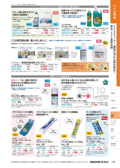 トイレ用品トイレクリーナー(頑固な汚れ&尿石除去)・尿石・トイレ臭除去剤保健室室洗面所洗面所清掃用品トイレ用品ティッシュッペーパー・ペーパー・タオルタオル飲料・食品キッチンキッチン用品用品事務用品・事務用品・その他他※パッケージデザインは変更になる場合があります。トイレクリーナー(頑固な汚れ&尿石除去)トロ〜リ濃い液がふちウラの尿石に密着洗浄!爽やかなフレッシュハーブの香りで、お掃除しながらイヤな臭いをスッキリ消臭。[ライオン]トイレのルック450mLお申込番号商品種別M価税抜税抜価格450mL8-637-01188-637-0119¥226¥1,312●液性/酸性(塩素系成分不使用)●包装数:1/24450mL)、1/3業務用4L)¥206¥1,193業務用4Lオープン1本酸性4L税込価格単位粘度があってたれ落ちにくく、少量使用で経済的!※酸性タイプは塩素系の製品と一緒に使わないでください。塩素系ガスが出て危険です。[大日本除虫菊]サンポールK1本500mL酸性5Lお申込番号8-637-01148-637-0115商品種別500mLお徳用5L型式/85151型式/85156M価税抜¥245¥2,060税抜価格¥198¥1,695税込価格単位¥217¥1,8641本●液性/酸性●包装数:1/24(500mL)、1/2(お徳用5L)「この尿石除去剤、臭いがしない!」塩酸濃度が9.9%で劇物に該当せず、常備保存ができます。※酸性タイプは塩素系の製品と一緒に使わないでください。塩素系ガスが出て危険です。酸性使用方法1小便器のトラップをはずし、中に水がたまるタイプは、ポンプで水を抜く。2ゼロパワーを入れてそのまま15〜20分置く。3尿石がやわらかくなるので、周囲やトラップを擦って落とす。1kg4kgトラップはゼロパワーに浸けておく。すぐ擦らずしっかり反応させる。擦って落とす。最後に水をたっぷり流し、トラップを元に戻す。[ユタコロジー]無臭尿石除去剤ゼロパワーお申込番号8-637-02608-637-0261商品種別M価税抜1kg4kgオープン税抜価格¥2,500¥7,800税込価格¥2,750¥8,580単位1本●液性/酸性●材質/容器:ポリエチレン●包装数:1/91kg)、1/4(4kg)小便器のトラップ内など、頑固な尿石汚れを除去しましょう!このような頑固な汚れはゼロパワーで改善!使用前使用後酸性タイプは、低臭で尿石や水あかなどの頑固な汚れが除去できます。※酸性タイプは塩素系の製品と一緒に使わないでください。塩素系ガスが出て危険です。[リンレイ]R'SPRO酸性トイレクリーナー800mL酸性強力タイプ。お申込番号8-637-0147M価税抜¥660税抜価格¥530税込価格単位¥5831本商品種別酸性型式/SW-988-216-0●液性/酸性●材質/成分:塩酸(10%未満)・非イオン系界面活性剤・粘度調整剤・消泡剤・香料・染料・水●内容量/800mL●包装数:1/12尿石・トイレ臭除去剤的があると狙いたくなる心理を利用して、尿の飛散を減らすものです。マークは尿がかかり一定温度になると色が変わります。10枚入ウチダスオリジナルデザイン!男性小便器用トイレターゲットシール10枚入お申込番号8-637-0259M価税抜¥2,400税抜価格¥1,744●寸法/本体:30(径)mm●材質/PETフィルム●包装数:1小便器の排水溝から約10〜15cm付近にシールを貼ってください。税込価格単位¥1,9181セット(10枚入)パラジクロルベンゼン未使用。ケースのまま便器に投入するだけで、尿石付着生成を防ぎます。パラジクロルベンゼン製剤の清浄防臭剤です。男子トイレ用。皆知ってる定番品。ケースが無いので、補充時期がわかりやすい!男子トイレ用。便器に投入するだけで尿石付着生成を防ぎます。男子トイレ用。2球入[桂屋ファイングッズ]ミリオンブルーボールECO2球入お申込番号8-637-0151商品種別型式/14226単位1袋M価税抜税抜価格税込価格¥786¥864(2球入)¥1,500●寸法/50幅)×130奥)×40高)mm●質量/50g●包装数:1/10男子トイレ用。5球入5球入[桂屋ファイングッズ]ミリオントイレカラー5球入1袋お申込番号8-637-0061商品種別型式/15001[エステー]トイレ用芳香ボール200g5球入1袋お申込番号8-637-0018単位1袋M価税抜¥270税抜価格¥146税込価格¥160(5球入)●寸法/60(幅)×210(奥)×40(高)mm●質量/200g●包装数:1/10単位1袋M価税抜¥280税抜価格¥168税込価格¥184(5球入)●質量/200g●成分/パラジクロルベンゼン、香料●包装数:1/105球入[桂屋ファイングッズ]ミリオンブルーボールケースなし5個入お申込番号8-637-0059商品種別型式/1422900単位1袋M価税抜税抜価格税込価格¥1,120¥1,232(5球入)¥1,250●質量/220g●成分/有機酸、パラジクロルベンゼン、香料、防錆剤、着色剤●包装数:1/60※表示価格は税込・税抜価格どちらも掲載しております。税抜価格を一番太い赤文字で、税込価格は消費税率10%として表示しております。2021177