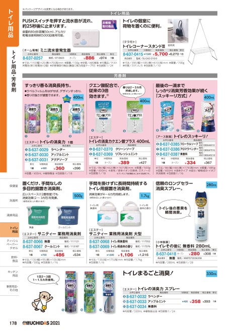 ※パッケージデザインは変更になる場合があります。PUSHスイッチを押すと流水音が流れ、約25秒後に止まります。音量約80dB距離50cm)、アルカリ乾電池使用時約5000回使用可能。トイレ用品トイレの個室に荷物を置くのに便利。[オーム電機]ミニ流水音発生器お申込番号8-637-0257商品種別型式/07-0603M価税抜オープン税抜価格¥886税込価格¥974単位1個[テラモト]トイレコーナースタンドⅢ使用例お申込番号M価税抜税抜価格税込価格単位8-637-0415¥7,500¥5,700¥6,2701台商品種別型式/SU-242-210-0●寸法/110(幅)×25(奥)×70(高)mm●質量/130g●材質/ABS樹脂●付属品/テスト用電池(単三乾電池×2個)●お客様取付商品(裏面に強力両面テープ付)●包装数:1/24●寸法/395幅)×185(奥)×610(高)mm●質量/730g●材質/ステンレス●包装数:1/10芳香剤最後の一滴までしっかり消臭芳香効果が続く「スッキーリ方式」!400mL●●●[アース製薬]トイレのスッキーリ!49010806469104901080647016型式/49010806492188-637-0385フローラルソープ型式/8-637-0386アロマラベンダー型式/8-637-0387無香料●●●お申込番号商品種別クエン酸配合で、従来の3倍効きます。※香りは2〜3カ月持続します。(使用状況により異なります)400mL[エステー]トイレの消臭力クエン酸プラス400mL商品種別クリーンソープリフレッシュミントお申込番号8-637-03708-637-0369❹❺●●単位1個M価税抜オープン税抜価格¥389税込価格¥427単位1個M価税抜オープン税抜価格¥334税込価格¥367●寸法/86(幅)×62(奥)×167(高)mm●質量/500g●容量/400mL●液性/液体イオン交換体、エタノール●包装数:1/18※アンモニア処理能力に対する効果です。●寸法/86(幅)×66(奥)×174(高)mm●質量/485g●容量/400ml●液体タイプ●成分/植物成分・イオン系消臭剤●包装数:1/16手間を掛けずに長時間持続するトイレ用据置き消臭剤。信頼のロングセラー消臭スプレー。280mLすっきり香る消臭長持ち。●ラベルフィルムをはがせば、デザインすっきり。●香りの強さが調整できます。400mL商品種別ラベンダーアップルミントアクアソープ税抜価格¥360税込価格¥396お申込番号8-637-00298-637-00308-637-0031❶❷❸単位1個M価税抜¥420●容量/400mL●植物精油●包装数:1/18●●●[エステー]トイレの消臭力1個500g消臭効果が4〜6カ月持続します。(使用状況により異なります)トイレ用無香料1.7kgトイレ用森林の香りトイレ後の悪臭を瞬間消臭。保健室保健室洗面所洗面所置くだけ、手間なしの多目的据置き消臭剤。広いスペース(12畳程度)でも消臭効果(2〜3カ月)を発揮。(使用状況により異なります)トイレ用品トイレ用品・芳香剤清掃用品清掃用トイレ用品ティッシュテペーパー・ペーパー・タオルタオル飲料・飲料食品食キッチンキッチン用品用品事務用品・事務用品・その他その他トイレまるごと消臭!330mL[エステー]トイレの消臭力スプレーM価税抜税抜価格税込価格単位¥420¥358¥3931本●内容量/330mL●植物抽出油●包装数:1/24お申込番号商品種別8-637-0032ラベンダー8-637-0033アップルミント8-637-0034無香料●●●[エステー]サニティー業務用消臭剤大型お申込番号商品種別8-637-0068トイレ用無香料8-637-0069トイレ用森林の香り型式/117352型式/117376[小林製薬]トイレその後に無香料280mL単位1個M価税抜¥1,500税抜価格¥1,106税込価格¥1,216●寸法/135(径)×175(高)mm●内容量/1.7kg●包装数:1/6お申込番号M価税抜8-637-0418オープン税抜価格¥280税込価格単位¥3081本商品種別無香型式/4987072036358●内容量/280mL●包装数:1/28無香クールミント[エステー]サニティー業務用消臭剤お申込番号8-637-00668-637-0067無香商品種別型式/111121クールミント型式/113187単位1個M価税抜¥700税抜価格¥486税込価格¥534●寸法/135(幅)×95(奥)×105(高)mm●内容量/500g●包装数:1/161日2〜3回1〜1.5カ月使用。●●●1782021