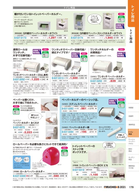トイレ用品トイレ用品保健室室洗面所洗面所清掃用品トイレ用品ティッシュッペーパー・ペーパー・タオルタオル飲料・食品キッチンキッチン用品用品事務用品・事務用品・その他他使用例2021179×○芯あり芯なし細芯太芯トイレットペーパーを1個ストックができます。使用例単位1個[東和産業]GR棚付ペーパーストックホルダーホワイト使用例お申込番号8-637-0174商品種別型式/44491M価税抜税抜価格税込価格オープン¥1,945¥2,139単位1個●寸法/180幅)×108奥)×115高)mm●質量/284.5g●使用可能ペーパーサイズ/107〜114mm●使用可能芯サイズ/38mm●付属品/ネジ・プラグ●お客様取付商品●包装数:1/40●寸法/179(幅)×110(奥)×298(高)mm●質量/608g●使用可能ペーパーサイズ/107〜114mm●使用可能芯サイズ/38mm●付属品/ネジ・プラグ●お客様取付商品●包装数:1/20ワンタッチホルダーのお買得品!通常ロール対応ホルダーです。芯あり※ネジ留め用です。[SANEI]ワンタッチペーパーホルダーお申込番号8-637-0293M価税抜¥960商品種別型式/W372-I税抜価格¥839税込価格単位¥9221個●寸法/157(幅)×105(奥)×95(高)mm●質量/165g●材質/ABS樹脂●取付方法/ビス留め●取付場所/木部、タイル壁など●芯ありペーパー用●最低保持紙幅/110mm●付属品/ビス●お客様取付商品●包装数:1/30※タイル壁、コンクリート壁などに取り付けの場合の固定具はお客様にてご用意ください。×○芯あり芯なし細芯太芯ワンタッチでペーパー交換可能!頑丈タイプです![SANEI]ワンタッチペーパーホルダーお申込番号M価税抜税抜価格税込価格8-637-0313¥1,750¥1,500¥1,650単位1個商品種別型式/W37-W●寸法/170(幅)×115(奥)×84(高)mm●質量/220g●材質/ABS樹脂●取付方法/本体背面付属の接着テープ、ビス留め●取付場所/木部、タイル壁など●芯ありペーパー用●最低保持紙幅/110mm●付属品/ビス●お客様取付商品●包装数:1/50※取り付け時には接着テープが使えます。(しっかり留めるにはさらにビス留めが必要です。)タイル壁、コンクリート壁などに取り付けの場合の固定具はお客様にてご用意ください。×○芯あり芯なし細芯太芯ペーパーホルダーのベーシック品。[SANEI]ステンレスペーパーホルダーお申込番号8-637-0283M価税抜¥1,130商品種別型式/PW33税抜価格¥981税込価格単位¥1,0791個●寸法/133(幅)×84奥)×81(高)mm、芯:23(径)mm●質量/160g●材質/ステンレス、同合金、ポリプロピレン●取付方法/ビス留め●取付場所/木部、タイル壁など●芯ありペーパー用●付属品/ホルダー棒、両面テープ、ビス、プラグ●お客様取付商品●包装数:1/60※タイル壁、コンクリート壁などに取り付けの場合の固定具はお客様にてご用意ください。[SANEI]ペーパーホルダー棒お申込番号8-637-0284M価税抜¥230商品種別型式/PW39税抜価格¥195税込価格¥214単位1本●寸法/23径)×140長)mm●質量/17g●材質/ポリプロピレン●包装数:1/360ほとんどの芯有りルダーにペーパーホ合います。伸縮してセットします。○○芯あり芯なし細芯太芯通常ロールはワンタッチ。片手で交換可能!通常ロールと細径芯無しロールに対応できます。芯無しのときは付属の細芯をお使いください。[SANEI]ワンタッチペーパーホルダー(芯なし兼用)お申込番号M価税抜税抜価格税込価格8-637-0292¥1,400¥1,220¥1,342単位1個商品種別型式/W373●寸法/本体:164(幅)×104(奥)×85(高)mm、細芯:12(径)mm●質量/183g●材質/ABS樹脂●取付方法/ビス留め●取付場所/木部、タイル壁など●芯あり・なしペーパー兼用●最低保持紙幅/110mm●付属品/ビス●お客様取付商品●包装数:1/60※タイル壁、コンクリート壁などに取り付けの場合の固定具はお客様にてご用意ください。使う人にやさしい!使用例ペーパーは置くだけ、片手で楽に下向きカット。カットする部分はやわらかい樹脂製で、本体は抗菌仕様です。○○芯あり芯なし細芯太芯[シマブン]ペーパーホルダーおくだけお申込番号8-637-0375商品種別型式/PR-1-S単位M価税抜1個¥2,500税抜価格税込価格¥2,223¥2,445●寸法/128幅)×130奥)×147(高)mm●質量/200g●芯あり・なしペーパー兼用●お客様取付商品●包装数:1/20棚が付いているトイレットペーパーホルダー。トイレ用品※トイレットペーパーは別売です。ペーパーホルダーの上に棚が付いているので、ポーチや携帯電話などの小物が置けます。[東和産業]GR棚付ペーパーホルダーホワイトお申込番号8-637-0173商品種別型式/44488M価税抜税抜価格税込価格オープン¥1,297¥1,426トイレットペーパーのストック用ボックスです。フタ部分は半透明になっています。※トイレットペーパーは別売です。ホワイト[伊勢藤]トイレットペーパーBOXピセお申込番号8-637-0318●ホワイト商品種別型式/4966149521225単位1個M価税抜¥1,200税抜価格¥1,100税込価格¥1,210●寸法/250(幅)×129奥)×129高)mm●質量/310g●材質/スチロール樹脂●包装数:1/30積み重ねも可能です。ロールペーパーを必要な長さにカットできて経済的!×○芯あり芯なし細芯太芯ピンク税抜価格税込価格¥590¥649単位1個丸穴径約38mmで、幅110〜115mmのロールペーパー(トイレットペーパー)が取り付けられます。※トイレッ