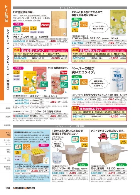 FSC認証紙を採用。パルプ100%、FSC認証紙を採用の人と森にやさしいトイレットロールです。ながーく使える長尺ロール。SDGs達成に活用可能。芯あり114mm幅シングル120m6ロール入ミシン目入エンボス[王子ネピア]ネピアアスモリ6ロール120m巻トイレットペーパー130mと長く巻いてあるので取替える手間が少ない!芯なし114mm幅6ロール入シングル130mソフトでやさしい肌ざわりです。お申込番号8-637-0439シングル120m商品種別型式/4901121211329M価税抜オープン税抜価格税込価格¥480¥528単位1パック(6ロール入)●寸法/114幅)mm×120長)m●穴径/38mm●材質/フレッシュパルプ●ミシン目入●エンボス●芯あり●FSC認証紙●包装数:1/8まとめ買いパックお得[王子ネピア]ネピアアスモリ6ロール1組(8パック入)※1組単位申込。[特種東海エコロジー]エコロジー芯なし6RS1306ロール1パックお申込番号8-637-0303商品種別シングル130mM価税抜型式/089601オープン税抜価格税込価格¥480¥528単位1パック(6ロール入)●寸法/114(幅)mm×130(長)m●穴径/約38mm●材質/再生紙●芯なし●包装数:1/8まとめ買いパックお得※1組単位申込。[特種東海エコロジー]エコロジー芯なし6RS1306ロール1組(8パック入)お申込番号8-637-0438単位1組(8パック入)●梱包ケース寸法/461×446×357mm芯あり12ロール入ミシン目入エンボス税抜価格¥3,800税込価格¥4,180お申込番号8-637-0308単位1組(8パック入)税抜価格¥3,800税込価格¥4,180ソフトな使用感です。●梱包ケース寸法/460×460×360mmペーパーの幅が狭いエコタイプ。107mm幅ダブル50m●芯なし105mm幅6ロール入シングル150m通常よりも幅が約9mm狭いエコタイプ。[コアレックス]業務用ワンタッチコアレス150-1051パックお申込番号8-637-0264商品種別シングル150m型式/31009M価税抜オープン税抜価格税込価格¥540¥594単位1パック(6ロール入)●寸法/105幅)mm×150長)m●穴径/約36mm●材質/再生紙●芯なし●包装数:1/8※105mm幅対応のワンタッチペーパーホルダーでもお使いいただけますが貫通式のホルダーでの使用をおすすめします。まとめ買いパックお得※1組単位申込。[コアレックス]業務用ワンタッチコアレス150-1051組(8パック入)お申込番号8-637-0274単位1組(8パック入)●梱包ケース寸法/450×450×325mm税抜価格¥4,230税込価格¥4,653M価税抜税抜価格税込価格単位オープン¥359¥3941パック(12ロール入)商品種別シングル60mダブル30m型式/032101型式/031101お申込番号8-637-00518-637-0053❷●●寸法/114(幅)mm×シングル:60長)m、ダブル:30(長)m●穴径/38mm●材質/再生紙●ミシン目入●エンボス●芯あり●包装数:1/8[特種東海エコロジー]エコロジー1072倍巻12RWお申込番号8-637-0437●ダブル50m商品種別型式/037001M価税抜オープン税抜価格税込価格¥530¥583単位1パック(12ロール入)●寸法/107(幅)mm×50(長)m●穴径/38mm●材質/再生紙●ミシン目入●エンボス●芯あり●消臭香料付き●包装数:1/8114mm幅シングル60mダブル30m●●[特種東海エコロジー]エコロジー12ロール1パックトイレ用品トイレットペーパートイレットペーパー(業務用)保健室保健室洗面所洗面所清掃用品清掃用トイレ用品ティッシュテペーパー・ペーパー・タオルタオル飲料・飲料食品食キッチンキッチン用品用品事務用品・事務用品・その他その他個包装で衛生的なトイレットペーパー。ゴールドリボンは小児がんの子供たちを支える活動のための世界共通のシンボルマークです。この製品は売上げの一部を「ゴールドリボン」を通じて小児がんの子供たちを支える活動に役立てています。シングル100m芯あり114mm幅80ロール入ミシン目入エンボス[特種東海エコロジー]エコロジーゴールドリボンシングル100m(個包装)お申込番号M価税抜税抜価格税込価格8-637-0265オープン¥5,980¥6,578単位1箱(80ロール入)商品種別型式/018110●寸法/114(幅)mm×100(長)m●穴径/38mm●材質/再生紙●ミシン目入●エンボス●芯あり●梱包ケース寸法/440×530×480mm●包装数:11802021トイレットペーパー(業務用)150mと長く巻いてあるので取替える手間が少ない!ソフトでやさしい肌ざわりです。個包装で衛生的。114mm幅シングル150m48ロール入ソフトでやさしい肌ざわりです。114mm幅シングル130m48ロール入芯なし[特種東海エコロジー]芯なしエコロジー1RS150(個包装)48ロールお申込番号M価税抜8-637-0304オープン税抜価格¥4,500商品種別シングル150m税込価格¥4,950型式/080101単位1箱(48ロール入)[特種東海エコロジー]芯なし芯なし業務用1RS13048ロールお申込番号M価税抜8-637-0421オープン税抜価格¥3,819商品種別シングル130m税込価格¥4,200型式/089103単位1箱(48ロール入)●寸法/114(幅)mm×150(長)m●穴径/約38mm●材質/再生紙●芯なし●梱包ケース寸法/460×460×360mm●包装数:1●寸法/114(幅)mm×130(長)m●穴径/約38mm●材質/再生紙●芯なし●個装なし●梱包ケース寸法/460×460×360mm●包装数:1