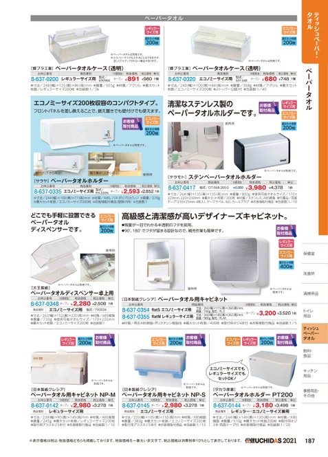 ティッシュペーパー・タオルペーパータオルペーパータオルレギュラーサイズ用最大セット枚数200枚エコノミーサイズ用最大セット枚数200枚[蝶プラ工業]ペーパータオルケース(透明)[蝶プラ工業]ペーパータオルケース(透明)※ペーパータオルは別売です。※エコノミーサイズも入れることはできますが、正しくプルアップされない場合があります。※ペーパータオルは別売です。お申込番号8-637-0200商品種別レギュラーサイズ用型式/690984M価税抜オープン税抜価格税込価格¥891¥980単位1個お申込番号8-637-0320商品種別エコノミーサイズ用型式/691448M価税抜オープン税抜価格税込価格¥680¥748単位1個●寸法/244幅)×125奥)×86(高)mm●質量/505g●材質/アクリル●最大セット枚数/レギュラーサイズ200枚●包装数:1/36●寸法/240(幅)×100(奥)×84(高)mm●質量/358g●材質/アクリル●最大セット枚数/エコノミーサイズ200枚●ストッパー(2個)付●包装数:1/40エコノミーサイズ200枚収容のコンパクトタイプ。フロントパネルを差し換えることで、据え置きでも壁付けでも使えます。エコノミーサイズ用最大セット枚数200枚※ペーパータオルは別売です。清潔なステンレス製のペーパータオルホルダーです。使用例レギュラーサイズ用エコノミーサイズ用最大セット枚数200枚壁付け(下から取る)据え置き(上から取る)[サラヤ]ペーパータオルホルダーお申込番号8-637-0335商品種別エコノミーサイズ用型式/PH-200NM価税抜オープン税抜価格税込価格単位¥2,593¥2,8521台●寸法/244(幅)×100(奥)×77(高)mm●材質/ABS、バネ:ポリプロピレン●質量/270g●最大セット枚数/エコノミーサイズ200枚●お客様取付商品(壁掛け時)●包装数:1使用例[テラモト]ステンペーパータオルホルダー※ペーパータオルは別売です。お申込番号8-637-0417商品種別型式/OT-568-200-0M価税抜¥5,300税抜価格¥3,980税込価格¥4,378単位1台●寸法/264(幅)×135(奥)×135(高)mm●質量/800g●使用可能タオルサイズ/170×220mm、220×230mm●最大セット枚数/200枚●材質/ステンレス、ABS樹脂●付属品/両面テープ(230×25mm・4枚入)、ゲージラベル、ねじ、カールプラグ●お客様取付商品●包装数:1/10どこでも手軽に設置できるペーパータオルディスペンサーです。エコノミーサイズ用最大セット枚数200枚高級感と清潔感が高いデザイナーズキャビネット。●残量が一目でわかる半透明のフタを採用。●90°、180°でフタが留まる設計なので、補充作業も簡単です。使用例※ペーパータオルは別売です。[大王製紙]ペーパータオルディスペンサー卓上用お申込番号M価税抜税抜価格税込価格8-637-0348オープン¥2,280¥2,508単位1台商品種別エコノミーサイズ用型式/793924●寸法/263幅)×152(奥)×220高)mm●材質/ABS樹脂●質量/730g●使用可能タオルサイズ/170×220mm●最大セット枚数/エコノミーサイズ200枚●包装数:1[日本製紙クレシア]ペーパータオル用キャビネット使用例お申込番号8-637-03548-637-0355商品種別flatSエコノミーサイズ用flatMレギュラーサイズ用寸法/260(幅)×115(奥)×260高)mm、質量/740g、型式/FL-S寸法/260(幅)×145(奥)×262高)mm、質量/980g、型式/FL-M●材質/再生ABS樹脂・ポリスチレン樹脂他●最大セット枚数/400枚●取付用ネジ4本付●お客様取付商品●包装数:1/5レギュラーサイズ用エコノミーサイズ用最大セット枚数400枚保健室室洗面所洗面所※ペーパータオルは別売です。清掃用品M価税抜税抜価格税込価格単位オープン¥3,200¥3,5201台トイレトイレ用品ティッシュペーパー・タオル飲料・食品キッチンキッチン用品用品事務用品・事務用品・その他他レギュラーサイズ用最大セット枚数200枚エコノミーサイズ用最大セット枚数200枚エコノミーサイズ用レギュラーサイズ用最大セット枚数200枚※ペーパータオルは別売です。[日本製紙クレシア]ペーパータオル用キャビネットNP-MエコノミーサイズでもレギュラーサイズでもセットOK![日本製紙クレシア]※ペーパータオルは別売です。[タカラ産業]※ペーパータオルは別売です。ペーパータオル用キャビネットNP-SペーパータオルホルダーPT200お申込番号M価税抜税抜価格税込価格8-637-0142オープン¥2,980¥3,278単位1台お申込番号M価税抜税抜価格税込価格8-637-0145オープン¥2,980¥3,278単位1台お申込番号M価税抜税抜価格税込価格8-637-0144オープン¥3,180¥3,498単位1台商品種別レギュラーサイズ用商品種別エコノミーサイズ用商品種別レギュラー・エコノミーサイズ兼用●寸法/239(幅)×90奥)×145(高)mm●材質/ABS樹脂●質量/245g●最大セット枚数/レギュラーサイズ200枚●取付用プラスネジ3本付●お客様取付商品●包装数:1/10●寸法/233(幅)×105奥)×132(高)mm●材質/ABS樹脂●質量/380g●最大セット枚数/エコノミーサイズ200枚●取付用プラスネジ3本付●お客様取付商品●包装数:1/10●寸法/244(幅)×149(奥)×130高)mm●材質/ABS樹脂●質量/510g●最大セット枚数200枚●取付用ネジ3本・両面テープ付●お客様取付商品●包装数:1/20※表示価格は税込・税抜価格どちらも掲載しております。税抜価格を一番太い赤文字で、税込価格は消費税率10%として表示しております。2021187