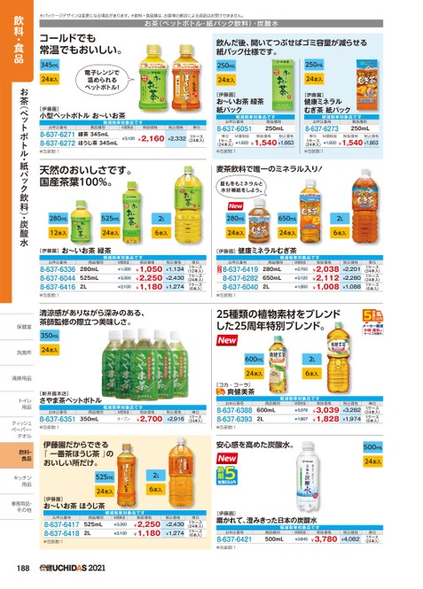 ※パッケージデザインは変更になる場合があります。※飲料・食品類は、お客様の都合による返品はお受けできません。お茶(ペットボトル・紙パック飲料)・炭酸水コールドでも常温でもおいしい。345mL24本入電子レンジで温められるペットボトル!飲んだ後、開いてつぶせばゴミ容量が減らせる紙パック仕様です。250mL24本入250mL24本入[伊藤園]小型ペットボトルお〜いお茶軽減税率対象品お申込番号8-637-62718-637-6272●包装数:1商品種別M価税抜税抜価格税込価格単位緑茶345mLほうじ茶345mL¥3,120¥2,160¥2,3321ケース(24本入)天然のおいしさです。国産茶葉100%。[伊藤園]お〜いお茶緑茶紙パック軽減税率対象品[伊藤園]健康ミネラルむぎ茶紙パック軽減税率対象品お申込番号8-637-6051商品種別250mLお申込番号8-637-6273商品種別250mL単位M価税抜税抜価格税込価格1ケース(24本入)¥1,920¥1,540¥1,663●包装数:1単位M価税抜1ケース(24本入)¥1,920●包装数:1税抜価格税込価格¥1,540¥1,663麦茶飲料で唯一のミネラル入り!夏も冬もミネラルと水分補給をしよう。280mL12本入525mL24本入2L6本入280mL24本入650mL24本入2L6本入[伊藤園]お〜いお茶緑茶軽減税率対象品[伊藤園]健康ミネラルむぎ茶軽減税率対象品お申込番号8-637-63368-637-60448-637-6416●包装数:1商品種別280mL525mL2LM価税抜¥1,380¥3,360¥2,100税抜価格¥1,050¥2,250¥1,180税込価格¥1,134¥2,430¥1,274単位1ケース(12本入)1ケース(24本入)1ケース(6本入)お申込番号8-637-64198-637-62828-637-6040商品種別280mL650mL2LM価税抜¥2,760¥3,120¥1,860税抜価格¥2,038¥2,112¥1,008税込価格¥2,201¥2,280¥1,088単位1ケース(24本入)1ケース(24本入)1ケース(6本入)●包装数:1清涼感がありながら深みのある、茶師監修の際立つ美味しさ。350mL24本入25種類の植物素材をブレンドした25周年特別ブレンド。沖縄・離島はサービス対象外600mL24本入2L6本入[新井園本店]さやま茶ペットボトル軽減税率対象品お申込番号8-637-6351商品種別350mLM価税抜オープン税抜価格¥2,700税込価格¥2,916単位1ケース(24本入)●包装数:1[コカ・コーラ]爽健美茶お申込番号8-637-63888-637-6393●包装数:1商品種別600mL2L軽減税率対象品M価税抜¥3,378¥1,867税抜価格¥3,039¥1,828税込価格¥3,282¥1,974単位1ケース(24本入)1ケース(6本入)伊藤園だからできる『一番茶ほうじ茶』のおいしい所だけ。525mL24本入2L6本入[伊藤園]お〜いお茶ほうじ茶軽減税率対象品お申込番号8-637-64178-637-6418商品種別525mL2LM価税抜¥3,360¥2,100税抜価格¥2,250¥1,180税込価格¥2,430¥1,274単位1ケース(24本入)1ケース(6本入)●包装数:1安心感を高めた炭酸水。500mL24本入[伊藤園]磨かれて、澄みきった日本の炭酸水軽減税率対象品お申込番号8-637-6421●包装数:1商品種別500mLM価税抜¥3,840税抜価格¥3,780税込価格¥4,082単位1ケース(24本入)飲料・食品お茶(ペットボトル・紙パック飲料)・炭酸水保健室保健室洗面所洗面所清掃用品清掃用トイレトイレ用品用品ティッシュテペーパー・ペーパー・タオルタオル飲料・食品キッチンキッチン用品用品事務用品・事務用品・その他その他1882021