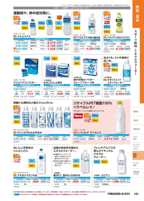 飲料・食品スポーツ飲料・ミネラルウォーター保健室室洗面所洗面所清掃用品※パッケージデザインは変更になる場合があります。※飲料・食品類は、お客様の都合による返品はお受けできません。スポーツ飲料・ミネラルウォーター沖縄・離島はサービス対象外500mL24本入沖縄・離島はサービス対象外500mL24本入[コカ・コーラ]アクエリアス経口補水液軽減税率対象品お申込番号8-637-6347商品種別500mL[コカ・コーラ]アクエリアス1日分のマルチビタミン軽減税率対象品お申込番号8-637-6383商品種別500mL税抜価格税込価格¥4,320¥4,665単位M価税抜1ケース(24本入)¥3,378●包装数:1税抜価格税込価格¥2,750¥2,970単位M価税抜1ケース(24本入)¥4,444●包装数:11L用5袋入水よりも、ヒトの身体に近い水。300mL24本入沖縄・離島はサービス対象外[大塚製薬]ポカリスエットーイオンウォータ軽減税率対象品[赤穂化成]熱中対策水パウダーグレープフルーツ味軽減税率対象品お申込番号8-637-6196お申込番号8-637-6312商品種別300mL単位1箱M価税抜¥571税抜価格¥498税込価格¥537(5袋入)●内容量/41g×5袋入●包装数:1単位M価税抜1ケース(24本入)¥2,400●包装数:1税抜価格税込価格¥2,352¥2,540商品種別300mL500mL2LM価税抜¥2,756¥3,378¥2,039税抜価格¥2,479¥2,750¥1,223税込価格¥2,677¥2,970¥1,320単位1ケース(24本入)1ケース(6本入)お申込番号8-637-63488-637-62058-637-6084値下●包装数:1[コカ・コーラ]アクエリアス軽減税率対象品沖縄・離島はサービス対象外300mL24本入500mL24本入2L6本入1L用5袋入1L用5袋入運動時や、熱中症対策に。[コカ・コーラ]アクエリアスパウダー軽減税率対象品[大塚製薬]ポカリスエット粉末軽減税率対象品お申込番号8-637-6253お申込番号8-637-6117単位1箱M価税抜¥572税抜価格¥514税込価格¥555(5袋入)●内容量/48g×5袋入●包装数:1単位1箱M価税抜¥650税抜価格¥630税込価格¥680(5袋入)●内容量/74g×5袋入●包装数:1/20移動にも便利な小型のスリムボトル。沖縄・離島はサービス対象外310mL30本入リサイクルPET樹脂100%×ラベルレス!SDGsをテーマにした授業にもオススメです。560mL24本入沖縄・離島はサービス対象外[キリンビバレッジ]キリンのやわらか天然水軽減税率対象品[コカ・コーラ]い・ろ・は・すラベルレス軽減税率対象品お申込番号8-637-6216●包装数:1商品種別310mLM価税抜¥2,400おいしい天然水のいいとこどり。沖縄・離島はサービス対象外2L6本入[キリンビバレッジ]アルカリイオンの水軽減税率対象品税抜価格税込価格¥2,112¥2,280単位1ケース(30本入)お申込番号8-637-6402●包装数:1商品種別560mLM価税抜¥2,911税抜価格税込価格¥2,619¥2,828品質の安全性を高めたミネラルウォーター。●2種類のフィルターを使用し、天然水にさらに磨きをかけています。●天然水由来の良質ミネラルを含む、おいしい軟水です。2L6本入[伊藤園]磨かれて、澄みきった日本の水軽減税率対象品フレンチアルプスが育んだナチュラルミネラルウォーター。330mL24本入[伊藤園]エビアン軽減税率対象品単位1ケース(24本入)トイレトイレ用品ティッシュッペーパー・ペーパー・タオルタオル飲料・食品キッチンキッチン用品用品事務用品・事務用品・その他他お申込番号M価税抜8-637-8105¥1,500税抜価格¥900税込価格¥972単位1ケース(6本入)お申込番号M価税抜8-637-6191¥1,380税抜価格¥850税込価格¥918単位1ケース(6本入)お申込番号M価税抜8-637-8112¥2,568税抜価格¥1,988税込価格¥2,147単位1ケース(24本入)商品種別●包装数:12L商品種別●包装数:12L商品種別●包装数:1330mL※表示価格は税込・税抜価格どちらも掲載しております。税抜価格を一番太い赤文字で、税込価格は消費税率10%として表示しております。※のオビがついている商品は、軽減税率の対象品となりますので消費税率8%として表示しております。2021189