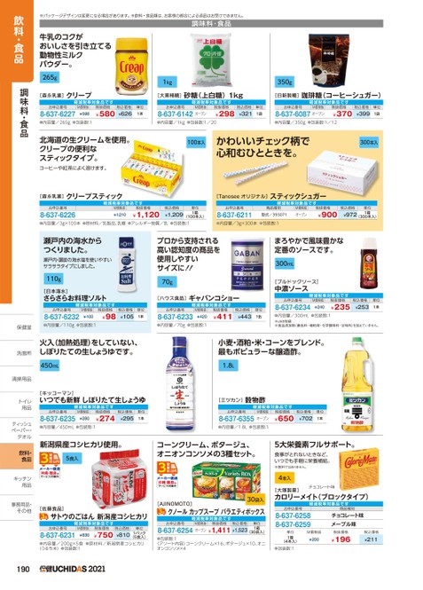 ※パッケージデザインは変更になる場合があります。※飲料・食品類は、お客様の都合による返品はお受けできません。調味料・食品牛乳のコクがおいしさを引き立てる動物性ミルクパウダー。265g[森永乳業]クリープ軽減税率対象品お申込番号8-637-6227M価税抜¥598●内容量/265g●包装数:1税抜価格¥580税込価格¥626単位1本北海道の生クリームを使用。クリープの便利なスティックタイプ。コーヒーや紅茶によく溶けます。1kg350g[大東精糖]砂糖(上白糖)1kg軽減税率対象品[日新製糖]珈琲糖(コーヒーシュガー)軽減税率対象品お申込番号M価税抜8-637-6142オープン税抜価格¥298税込価格単位¥3211袋お申込番号M価税抜8-637-6087オープン税抜価格¥370税込価格単位¥3991袋●内容量/1kg●包装数:1/20●内容量/350g●包装数:1/12100本入かわいいチェック柄で心和むひとときを。300本入[森永乳業]クリープスティック軽減税率対象品[Tanoseeオリジナル]スティックシュガー軽減税率対象品お申込番号8-637-6226M価税抜¥1,210税抜価格¥1,120税込価格¥1,209単位1箱(100本入)お申込番号8-637-6211商品種別型式/393071M価税抜オープン税抜価格¥900●内容量/3g×100本●原材料/乳製品、乳糖●アレルギー物質/乳●包装数:1●内容量/3g×300本●包装数:1税込価格¥972単位1箱(300本入)瀬戸内の海水からつくりました。瀬戸内・讃岐の海水塩を使いやすいサラサラタイプにしました。110g[日本海水]さらさらお料理ソルト軽減税率対象品プロから支持される高い認知度の商品を使用しやすいサイズに!!70g[ハウス食品]ギャバンコショー軽減税率対象品お申込番号8-637-6232M価税抜¥100●内容量/110g●包装数:1税抜価格¥98税込価格単位¥1051本お申込番号8-637-6233M価税抜¥420●内容量/70g●包装数:1税抜価格¥411税込価格¥443単位1缶まろやかで風味豊かな定番のソースです。300mL[ブルドックソース]中濃ソース軽減税率対象品お申込番号8-637-6234M価税抜¥240税抜価格¥235税込価格¥253単位1本●内容量/300mL●包装数:1※JAS特級※食品添加物(着色料・増粘剤・化学調味料・甘味料)を加えていません。火入(加熱処理)をしていない、しぼりたての生しょうゆです。450mL小麦・酒粕・米・コーンをブレンド。最もポピュラーな醸造酢。1.8L[ミツカン]穀物酢軽減税率対象品お申込番号8-637-6355M価税抜オープン●内容量/1.8L●包装数:1税抜価格¥650税込価格¥702単位1本コーンクリーム、ポタージュ、オニオンコンソメの3種セット。沖縄・離島はサービス対象外30袋入[AJINOMOTO]クノールカップスープバラエティボックス軽減税率対象品お申込番号M価税抜8-637-6254オープン税抜価格税込価格¥1,411¥1,523単位1箱(30袋入)●包装数:1〈アソート内容〉コーンクリーム×16、ポタージュ×10、オニオンコンソメ×45大栄養素フルサポート。食事がとれないときなど、いつでも手軽に栄養補給。※飲料ではありません。4本入[大塚製薬]チョコレート味カロリーメイト(ブロックタイプ)軽減税率対象品お申込番号8-637-62588-637-6259商品種別チョコレート味メープル味単位1箱(4本入)M価税抜¥200税抜価格¥196税込価格¥211●包装数:1飲料・食品調味料・食品保健室保健室洗面所洗面所清掃用品清掃用トイレトイレ用品用品ティッシュテペーパー・ペーパー・タオルタオル飲料・食品キッチンキッチン用品用品事務用品・事務用品・その他その他[キッコーマン]いつでも新鮮しぼりたて生しょうゆ軽減税率対象品お申込番号8-637-6235M価税抜¥280税抜価格¥274税込価格¥295単位1本●内容量/450mL●包装数:1新潟県産コシヒカリ使用。5食入沖縄・離島はサービス対象外[佐藤食品]サトウのごはん新潟産コシヒカリ軽減税率対象品お申込番号8-637-6231M価税抜¥830税抜価格¥750税込価格¥810単位1パック(5食入)●内容量/200g×5食●原材料/新潟県産コシヒカリ(うるち米)●包装数:11902021