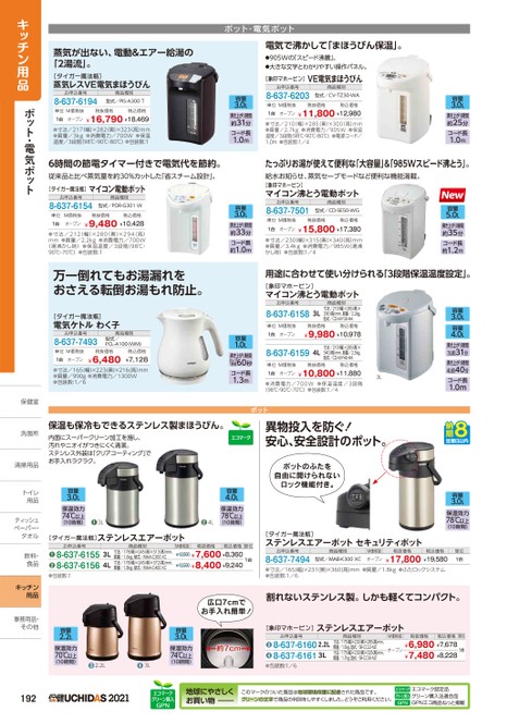蒸気が出ない、電動&エアー給湯の「2湯流」。[タイガー魔法瓶]蒸気レスVE電気まほうびんお申込番号8-637-6194商品種別型式/PIS-A300T単位M価税抜1台オープン税抜価格税込価格¥16,790¥18,469●寸法/217(幅)×282(奥)×323(高)mm●質量/3kg●消費電力/700W●保温温度/3段階(98℃・90℃・80℃)●包装数:16時間の節電タイマー付きで電気代を節約。従来品と比べ蒸気量を約30%カットした「省スチーム設計」。[タイガー魔法瓶]マイコン電動ポットお申込番号8-637-6154商品種別型式/PDR-G301W単位M価税抜1台オープン税抜価格税込価格¥9,480¥10,428●寸法/212(幅)×280(奥)×294(高)mm●質量/2.2kg●消費電力/700W(湯沸かし時)●保温温度/3段階(98℃・90℃・70℃)●包装数:1万一倒れてもお湯漏れをおさえる転倒お湯もれ防止。[タイガー魔法瓶]電気ケトルわく子お申込番号8-637-7493商品種別型式/PCL-A100WM単位M価税抜税抜価格税込価格1台オープン¥6,480¥7,128●寸法/165(幅)×223(奥)×216(高)mm●質量/990g●消費電力/1300W●包装数:1/6保温も保冷もできるステンレス製まほうびん。内面にスーパークリーン加工を施し、汚れやニオイがつきにくく清潔。ステンレス外装は「クリアコーティング」でお手入れラクラク。容量3.0L沸き上がり時間約31分コード長1.0m容量3.0L沸き上がり時間約33分コード長約1.0m容量.0L1沸き上がり時間60秒カップ1杯約コード長1.3mポット・電気ポット電気で沸かして「まほうびん保温」。●905Wの「スピード沸騰」。●大きな文字とわかりやすい操作パネル。[象印マホービン]VE電気まほうびんお申込番号8-637-6203商品種別型式/CV-TZ30-WA単位M価税抜1台オープン税抜価格税込価格¥11,800¥12,980●寸法/210(幅)×285(奥)×300(高)mm●質量/2.7kg●消費電力/905W●保温温度/3段階(98℃・90℃・80℃)●電源コード/1.0m●包装数:1/4容量3.0L沸き上がり時間約25分コード長1.0mたっぷりお湯が使えて便利な「大容量」&「985Wスピード沸とう」。給水お知らせ、蒸気セーブモードなど便利な機能満載。[象印マホービン]マイコン沸とう電動ポットお申込番号8-637-7501商品種別型式/CD-SE50-WG単位M価税抜1台オープン税抜価格税込価格¥15,800¥17,380●寸法/230(幅)×315奥)×340高)mm●質量/3.4kg●消費電力/985W(湯沸かし時)●包装数:1/4容量5.0L沸き上がり時間約35分コード長約1.2m用途に合わせて使い分けられる「3段階保温温度設定」。[象印マホービン]マイコン沸とう電動ポットお申込番号8-637-61583L商品種別寸法/210(幅)×285(奥)×290高)mm、質量/2.2kg、型式/CD-WY30-HA単位M価税抜1台オープン税抜価格税込価格¥9,980¥10,9788-637-61594L寸法/210(幅)×285(奥)×340高)mm、質量/2.5kg、型式/CD-WY40-HA単位M価税抜1台オープン税抜価格税込価格¥10,800¥11,880●消費電力/700W●保温温度/3段階(98℃・90℃・70℃)●包装数:1/43Lポットエコマーク異物投入を防ぐ!安心、安全設計のポット。キッチン用品ポット・電気ポット保健室保健室洗面所洗面所清掃用品清掃用トイレトイレ用品用品ティッシュテペーパー・ペーパー・タオルタオルキッチン用品事務用品・事務用品・その他その他192容量3.0L容量4.0L沸き上がり時間3L約31分沸き上がり時間4L約40分コード長1.0m容量3.0L保温効力78℃以上(10時間)2021エコマークグリーン購入GPN地球にやさしくお買い物このマークのついた商品は地球環境保護に配慮された商品です。グリーンの文字で商品の判別をしやすくしました。どうぞご利用ください。エコマークグリーン購入GPNエコマーク認定品グリーン購入法適合品GPNエコ商品ねっと掲載お申込番号8-637-7494商品種別型式/MAB-K300XCM価税抜オープン税抜価格税込価格¥17,800¥19,580単位1台●寸法/165(幅)×231(奥)×360(高)mm●質量/1.8kg●ふたロックシステム●包装数:1/6割れないステンレス製。しかも軽くてコンパクト。[象印マホービン]ステンレスエアーポット税抜価格税込価格¥6,980¥7,678¥7,480¥8,228単位1台商品種別寸法/175(幅)×230奥)×285高)mm、質量/1.5kg、型式/SR-CC22-NZ寸法/175(幅)×230奥)×325高)mm、質量/1.7kg、型式/SR-CC30-NZM価税抜オープンお申込番号8-637-61602.2L8-637-61613L●●●包装数:1/6ポットのふたを自由に開けられないロック機能付き。[タイガー魔法瓶]ステンレスエアーポットセキュリティポット容量3.0L保温効力74℃以上(10時間)❶3L容量4.0L保温効力78℃以上(10時間)❷4L[タイガー魔法瓶]ステンレスエアーポットM価税抜税抜価格税込価格単位¥12,000¥7,600¥8,360¥12,500¥8,400¥9,2401台商品種別寸法/178幅)×245(奥)×313高)mm、質量/1.6kg、型式/MAA-C300XC寸法/178幅)×245(奥)×372高)mm、質量/1.8kg、型式/MAA-C400XC3L4Lお申込番号8-637-61558-637-6156●●飲料・飲料食品食●包装数:1広口7cmでお手入れ簡単!容量2.2L保温効力70℃以上(10時間)❸2.2L❹3L容量3.0L保温効力74℃以上(10時間)