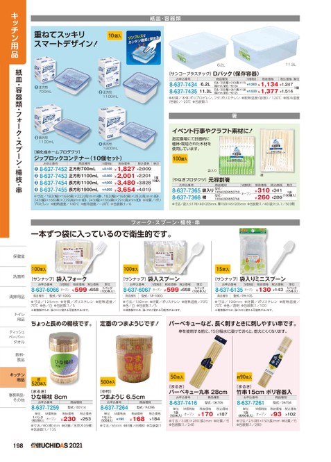 紙皿・容器類重ねてスッキリスマートデザイン!10個入6.2L11.3L[サンコープラスチック]Dパック(保存容器)●正方形700mL●正方形1100mL●❸長方形1100mL[旭化成ホームプロダクツ]ジップロックコンテナー(10個セット)●長方形1900mLお申込番号8-637-74348-637-74356.2L11.3L商品種別寸法/250(幅)×310(奥)×115(高)mm、型式/H0124寸法/292(幅)×361(奥)×138(高)mm、型式/H0125M価税抜税抜価格税込価格¥1,260¥1,134¥1,247¥1,530¥1,377¥1,514単位1個●材質/本体:ポリプロピレン、フタ:ポリエチレン●耐熱温度(容器)/120℃●耐冷温度(容器)/-20℃●包装数:1箸イベント行事やクラフト素材に!指定農場にて計画的に植林・栽培された木材を使用しています。100膳入単位袋入り[やなぎプロダクツ]元禄割箸裸お申込番号商品種別8-637-7365袋入り型式/8-637-7366裸14560309850759型式/14560309850766M価税抜オープン税抜価格税込価格¥310¥341¥260¥286単位1袋(100膳入)●寸法/袋入り:178×40×205mm、裸:160×45×205mm●包装数:1/40(袋入り)、1/50(裸)1箱(10個入)税抜価格税込価格¥1,827¥2,009¥2,001¥2,201¥3,480¥3,828¥3,654¥4,019M価税抜¥2,100¥2,300¥4,000¥4,200お申込番号商品種別8-637-7452正方形700mL8-637-7453正方形1100mL8-637-7454長方形1100mL8-637-7455長方形1900mL❷●●●●寸法/182(幅)×168(奥)×222(高)mm(●❶)、182(幅)×168(奥)×283(高)mm(●❷)、243(幅)×166(奥)×229(高)mm(●)、243(幅)×166(奥)×291(高)mm(●❹)●材質/ポリプロピレン●耐熱温度/140°C●耐冷温度/-20℃●包装数:1/6一本ずつ袋に入っているので衛生的です。フォーク・スプーン・楊枝・串100本入100本入15本入[サンナップ]袋入フォーク[サンナップ]袋入スプーン[サンナップ]袋入りミニスプーンお申込番号M価税抜8-637-6066オープン税抜価格税込価格¥599¥658単位1パック(100本入)お申込番号M価税抜8-637-6067オープン税抜価格税込価格¥599¥658単位1パック(100本入)お申込番号M価税抜8-637-6135オープン税抜価格税込価格¥130¥143単位1パック(15本入)商品種別型式/SF-100G商品種別型式/SP-100G商品種別型式/PA-10S●寸法/125mm●材質/ポリスチレン●耐熱温度/70℃●色/白●包装数:1/5※樹脂製のため、強くかむと割れる可能性があります。●寸法/130mm●材質/ポリスチレン●耐熱温度/70℃●色/白●包装数:1/5※樹脂製のため、強くかむと割れる可能性があります。●寸法/100mm●材質/ポリスチレン●耐熱温度/70℃●色/透明●包装数:1/100※樹脂製のため、強くかむと割れる可能性があります。ちょっと長めの楊枝です。定番のつまようじです!バーベキューなど、長く刺すときに刺しやすい串です。串を使用する前に、15分程水に浸けておくと、燃えにくくなります。約520本入[まるき]ひな楊枝8cmお申込番号8-637-7259単位M価税抜500本入商品種別型式/00114[中村]つまようじ6.5cmお申込番号8-637-7264商品種別型式/P4295税抜価格¥2301パック(約520本入)オープン●寸法/80長)mm●材質/天然木(白樺)●包装数:1/135¥253税込価格単位M価税抜1セット¥190(500本入)●寸法/65mm●材質/白樺材●包装数:1税抜価格¥168税込価格¥18450本入約90本入[まるき]バーベキュー丸串28cmお申込番号8-637-7416商品種別型式/06706[まるき]竹串15cmポリ容器入お申込番号8-637-7261商品種別型式/06704M価税抜単位1袋税抜価格¥170税込価格¥187(50本入)オープン●寸法/3(径)×280(長)mm●材質/竹●包装数:1/240単位1袋M価税抜税抜価格税込価格¥102(約90本入)オープン●寸法/2.5(径)×150(長)mm●材質/竹●包装数:1/280¥93キッチン用品紙皿・容器類・フォーク・スプーン・楊枝・串保健室保健室洗面所洗面所清掃用品清掃用トイレトイレ用品用品ティッシュテペーパー・ペーパー・タオルタオル飲料・飲料食品食キッチン用品事務用品・事務用品・その他その他1982021
