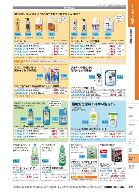 キッチン用品台所用洗剤保健室室洗面所洗面所清掃用品トイレトイレ用品ティッシュッペーパー・ペーパー・タオルタオル飲料・食品キッチン用品事務用品・事務用品・その他他台所用洗剤※パッケージデザインは変更になる場合があります。濃密泡で、パッと洗える!汚れ落ちを指先と音でキュッと実感!オレンジの香り。グレープフルーツの香り。240mL●本体300mL1380mL4.5L240mL300mL1380mL4.5L●本体(ポンプ)●つめかえ用●業務用●本体●本体(ポンプ)●つめかえ用●業務用[花王]キュキュット※小分けキャップは別売です。[花王]キュキュットクリア除菌※小分けキャップは別売です。1本税抜価格税込価格単位¥230¥370¥868¥253¥407¥954¥2,380¥2,618M価税抜オープン8-637-7353本体240mL8-637-7472本体(ポンプ)300mL8-637-7354つめかえ用1380mL8-637-7443業務用4.5L●●●●1本¥212¥370¥848¥233¥407¥932¥2,300¥2,530税抜価格税込価格単位お申込番号商品種別M価税抜オープン本体240mL8-637-72968-637-7471本体(ポンプ)300mL8-637-72978-637-7298業務用4.5Lつめかえ用1380mL●●●●お申込番号商品種別●中性●包装数:1/24(●❶)、1/12(●❷)、1/6(●❸)、1/4●❹)●弱酸性●包装数:1/24(●❺)、1/12●❻)、1/6(●❼)、1/4●❽)LOOKP.142花王業務用ボトル専用小分けキャップを掲載しております。スポンジが届かない汚れをすみずみ清潔!ヌルヌルの菌の巣も油汚れもWで除去!300mL●本体720mL●つめかえ用175mL●960mL●M価税抜オープン税抜価格¥161¥839税込価格単位¥177¥9221本1袋8-637-7496本体175mL8-637-7497つめかえ用960mL●●お申込番号商品種別[P&Gジャパン]除菌ジョイ●弱アルカリ性●包装数:1/24(●⓫)、1/6●⓬)植物油主原料で細かい泡立ち。スッキリ落ち、無添加だから安心。370mL●350mL●[ミヨシ石鹸]無添加食器洗いせっけんM価税抜¥250¥180税抜価格税込価格¥236¥259¥163¥179単位1本1袋商品種別本体370mL●●弱アルカリ性●包装数:1/20(●)、1/15(●)詰替用350mLお申込番号8-637-73008-637-8027●M価税抜オープン税抜価格¥360¥650税込価格単位¥396¥7151本8-637-7444本体300mL8-637-7445つめかえ用720mL●●お申込番号商品種別[花王]キュキュットCLEAR泡スプレー無香性●中性●無香性●包装数:1/12汚れ落ちも、すすぎも、食器の乾きが速く、食器洗いがラクにかたづく台所用洗剤。通常の洗剤の半量で使用できる濃縮タイプ。260mL●本体400mL●つめかえ用2L●業務用[ライオン]チャーミーVクイック税抜価格税込価格単位¥203¥294¥223¥323¥1,100¥1,2101本商品種別M価税抜本体260mLつめかえ用400mL●●●中性●包装数:1/24(●)、1/15●)、1/6(●)業務用2Lオープンお申込番号8-637-41768-637-41778-637-7064●手肌のうるおい分をしっかり守るので、安心して使えます。ライムの香りですっきりした洗い上がり。油汚れスッキリ落とし洗い上がりもスッキリ。※小分けキャップは別売です。4.5L600mL600mL[花王]ファミリーフレッシュ業務用[ライオン]チャーミーグリーン中[アドグッド]アドグッド食器用洗剤お申込番号8-637-8020単位1本M価税抜オープン税抜価格¥232税込価格¥255お申込番号8-637-7131単位1本M価税抜オープン税抜価格税込価格¥110¥121●内容量/600mL●中性●包装数:1/12●内容量/600mL●中性●包装数:1/20お申込番号8-637-7381単位M価税抜1本オープン商品種別型式/4901301021083税込価格税抜価格¥1,550¥1,705●内容量/4.5L●中性●包装数:1/4LOOK小分けキャップを掲載しております。P.142手強い油汚れに!18kg[ライオンハイジーン]プロワークお申込番号8-637-7498単位M価税抜1缶オープン商品種別型式/4903301310990税込価格税抜価格¥2,600¥2,860●内容量/18kg●寸法/238(幅)×238(奥)×349高)mm●液性/中性●包装数:1※表示価格は税込・税抜価格どちらも掲載しております。税抜価格を一番太い赤文字で、税込価格は消費税率10%として表示しております。2021201