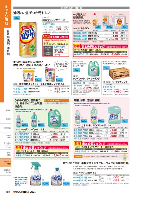 ●5kg台所用洗剤・漂白剤一歩進んだ新研磨料。カネヨン1本あるだけで水回りはいつもピカピカ。[カネヨ]カネヨン●550g●500g●5kg税込価格単位商品種別M価税抜本体550g詰替用500g詰替用5kgオープン¥1,700税抜価格¥172¥140¥189¥154¥1,370¥1,5071本1袋1個お申込番号8-637-80288-637-80298-637-7405●●●●弱アルカリ性●包装数:1/12(●❶・●❷)、1/3(●❸)まとめ買いパックお得[カネヨ]カネヨン1組(12本入)※1組単位申込。お申込番号8-637-7158●商品種別本体550g単位税抜価格1組(12本入)¥2,040税込価格¥2,244油汚れ、焦げつき汚れに!400g[カネヨ]泡立ちクレンザー1本お申込番号8-637-7465単位M価税抜1本オープン¥104●内容量/400g●弱アルカリ性●包装数:1/24税抜価格¥95税込価格お得まとめ買いパック※1組単位申込。[カネヨ]泡立ちクレンザー1組(24本入)お申込番号単位税抜価格税込価格8-637-74671組(24本入)¥2,160¥2,376キッチン用品台所用洗剤・漂白剤まっさら清潔キュッと実感!除菌・除渋・消臭・くすみ落としも!オレンジオイル配合(香料)です。庫内のニオイもスッキリ消臭。傷をつけないクリーミータイプのクレンザーです。6kg豊かに泡立ち、コゲつきや頑固な汚れを素早くキレイに落とします。15kg[花王]クリーミ-クレンザーホーミングお申込番号8-637-7132商品種別型式/021137単位M価税抜1本オープン税抜価格¥1,875税込価格¥2,062●内容量/6kg●材質/研磨剤・界面活性剤●弱アルカリ性●包装数:1/3※小分けキャップは別売です。単位1個1袋[ライオン]ライオンクレンザーお申込番号8-637-7071単位M価税抜1箱オープン税抜価格¥1,950税込価格¥2,145●内容量/7.5kg×2●粉末●中性●包装数:1●680mL●550mL[花王]食洗機用キュキュットクエン酸オレンジオイル税抜価格税込価格¥575¥632¥460¥506M価税抜オープン商品種別本体680mL詰替用550mLお申込番号8-637-73868-637-7387●●●弱アルカリ性●包装数:1/12うすめて使う、塩素系のつけおきタイプの台所用漂白剤。LOOK小分けキャップを掲載しております。P.142除菌、除臭、漂白に最適。※塩素系の製品は酸性タイプの製品と一緒に使わないでください。塩素系ガスが出て危険です。保健室保健室※塩素系の製品は酸性タイプの製品と一緒に使わないでください。塩素系ガスが出て危険です。M価税抜¥170¥300オープン税抜価格¥140¥248¥930税込価格単位¥154¥272¥1,0231本商品種別600mL1500mL5kg型式/KB600ML型式/KB1500ML型式/KB5KGお申込番号8-637-71878-637-71868-637-7185❾❿⓫●アルカリ性●包装数:1/20●)、1/8●❿)、1/3(●)まとめ買いパックお得[カネヨ]カネヨキッチンブリーチ1組(8本入)※1組単位申込。お申込番号8-637-7214❿商品種別1500mL単位税抜価格1組(8本入)¥1,904税込価格¥2,094LOOKP.110野菜洗いに安心の消毒液を掲載しております。●600mL●1500mL[カネヨ]カネヨキッチンブリーチ1本●600mL●1500mL●5kg[花王]キッチンハイター1本※小分けキャップは別売です。税抜価格¥196¥396¥1,170税込価格単位¥215¥435¥1,2871本商品種別M価税抜小600mL大1500mL●●●アルカリ性●包装数:1/20(●❻)、1/8(●❼)、1/3(●❽)業務用5kgオープンお申込番号8-637-80328-637-80338-637-7382●まとめ買いパックお得[花王]キッチンハイター1組(8本入)※1組単位申込。お申込番号商品種別単位税抜価格税込価格❼8-637-7160大1500mL1組(8本入)¥3,040¥3,344気づいたときに、手軽に使えるスプレータイプ台所用漂白剤。まな板、包丁、カップの除菌・漂白に。排水口のごみ受け、三角コーナーのヌメリ除去・消臭に。漂白なら5分、除菌だけなら手早く2分でできます。[花王]キッチン泡ハイターM価税抜オープン税抜価格¥330¥229税込価格単位¥363¥2511本商品種別型式/733801型式/733818本体お申込番号8-637-73298-637-7330⓭●●内容量/400mL●成分/次亜塩素酸ナトリウム、界面活性剤、水酸化ナトリウム●液性/アルカリ性●包装数:1/12付け替え用※塩素系の製品は酸性タイプの製品と一緒に使わないでください。塩素系ガスが出て危険です。●400mL●400mL2022021洗面所洗面所清掃用品清掃用トイレトイレ用品用品ティッシュテペーパー・ペーパー・タオルタオル飲料・飲料食品食キッチン用品事務用品・事務用品・その他その他