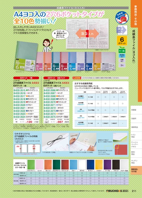 事務用品・その他成績表ファイル(ヨコ入れ)保健室室洗面所洗面所清掃用品トイレトイレ用品ティッシュッペーパー・ペーパー・タオルタオル飲料・食品キッチンキッチン用品用品事務用品・その他成績表ファイルタテ入れ/ヨコ入れカラー対応一覧タテ入れ7ポケット10ポケット6ポケットヨコ入れ10ポケット20ポケットライトグリーンピンクオレンジモスグリーンワインレッドブルーホワイトネイビーイエローパープルブラッククリアー(乳白)○-○○○○-○○○○-○○○○○○○○○○○○○○○○○○○○○○○○○○○○○○○○○○----○○-----○○○※表示価格は税込・税抜価格どちらも掲載しております。税抜価格を一番太い赤文字で、税込価格は消費税率10%として表示しております。2021211コれ6ヨ入ポケットヨコ入れ出し入れしやすいA4ヨコ入れ!2穴を利用してファイルやつづりひもでクラス別保管もできます。クリアーは表・裏表紙ともに透けているタイプです。成績表ファイル(ヨコ入れ)A4ヨコ入の2穴6ポケットタイプが全10色勢揃い!※健康カードはサンプルです。グリーン購入A4判ヨコ中紙なし2穴ピンクオレンジモスグリーンワインレッドブルーホワイトネイビーイエロークリアー(乳白)ライトグリーンLOOKUCHIDAS本誌には、成績表に最適な用紙を掲載しております。おすすめ成績表用紙UCHIDAS本誌に掲載しているニューケンパス及びケント紙中厚と、マルチ用紙をおすすめします。種類タテ入れヨコ入れ6ポケットヨコ入れ10ポケットヨコ入れ20ポケットA4薄口8-600-3957A4中厚8-600-3971A48-625-1913A38-625-1914A3中厚8-600-3973ケント紙ケント紙○○マルチ用紙○○○○○○○○○○マルチ用紙×○2枚まで○4枚まで○9枚までケント紙×○2枚まで○4枚まで-6ポケット1冊6ポケット5冊パック[ウチダ]2穴成績表ファイルA4ヨコ6ポケット1冊[ウチダ]2穴成績表ファイルA4ヨコ6ポケット5冊パックお申込番号商品種別8-632-3515●ライトグリーン8-632-3516●ピンク8-632-3517●オレンジ8-632-3518●モスグリーン8-632-3519●ワインレッド8-632-3520●ブルー8-632-3521●ホワイト8-632-3522●ネイビー8-632-3523●イエロー8-632-3524◎クリアー(乳白)お申込番号商品種別8-632-3566●ライトグリーン8-632-3567●ピンク8-632-3568●オレンジ8-632-3569●モスグリーン8-632-3570●ワインレッド8-632-3571●ブルー8-632-3572●ホワイト8-632-3573●ネイビー8-632-3574●イエロー8-632-3575◎クリアー(乳白)単位1冊M価税抜オープン税抜価格¥120税込価格¥132単位M価税抜1パック(5冊入)オープン税抜価格¥567税込価格¥623●寸法/305(縦)×228(横)mm●シート数/3枚(6ポケット)●ポケットシート厚/0.04mm●表紙厚/透明表紙:0.18mm、裏表紙:0.38mm●背幅/1mm●材質/再生ポリプロピレン●中紙なし●包装数:5冊パック1/10ウチダオリジナル2穴成績表ファイルの特長(A4ヨコ)※A4換算で6枚。A3換算ではA3が2枚+A4が2枚収納できる6ポケットタイプ。A4A3※6ポケットにはA3用紙は2枚まで収容できます。つづり紐を使って保管。両開きパイプ式ファイルを使っての保管。超薄型なので重ねて省スペース保管ができます。安全性を考え角に丸みをつけています。(ヨコ入れタイプのみ)