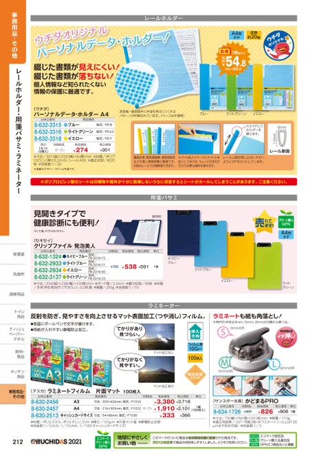 A4判タテ収容約20枚1冊あたり54.8(税込¥60.3)税抜¥お得レールホルダーウチダオリジナルパーソナルデータ・ホルダー!綴じた書類が見えにくい!綴じた書類が落ちない!個人情報など知られたくない情報の保護に最適です。[ウチダ]パーソナルデータ・ホルダーA4表表紙・裏表紙共に中身を見えにくくするパターンが印刷されています。(ベースは半透明)ブルーライトグリーンイエロー6mm13mmスライドしてホルダーを綴じます。型式/PD-B型式/PD-LG型式/PD-Y税込価格¥301お申込番号商品種別8-632-3315●ブルー8-632-3316●ライトグリーン8-632-3318●イエロー単位M価税抜1セット(5冊入)オープン税抜価格¥274●寸法/307(縦)×220(横)×6厚)mm●材質/ポリプロピレン(厚さ0.2mm)、レール:ABS●適正収容/約20枚●包装数:1/20※表紙のデザイン・カラーは共通です。職員名簿、緊急連絡網、進路相談表などの個人情報保護に最適です。6色のレールで分類保管できます。タイトル記入スペースにタイトルを記入しておけば、ちょっと引き出すだけで必要な資料を探せます。レール上部は差し込みしやすいようにカドをカットしています。※ポリプロピレン製のシートは印刷物や資料が十分に乾燥しないうちに収容するとシートがカールしてしまうことがあります。ご注意ください。見開きタイプで健康診断にも便利!※ヒモ通しの穴はありません。[セキセイ]クリップファイル発泡美人お申込番号商品種別8-632-1324●ネイビーブルー型式/8-632-2933●ライトブルー8-632-2934●イエロー8-632-3137●ライトグリーン型式/FB-2016-15型式/FB-2016-11型式/FB-2016-50FB-2016-33用箋バサミ使用例M価税抜税抜価格税込価格単位¥700¥538¥5911枚ネイビーブルー●寸法/334縦)×238(横)×10(厚)mm●ボード厚/2.5mm●最大収容/50枚●材質/本体:再生発泡ポリプロピレン、とじ具:鉄●質量/293g●包装数:1/10グリーン購入GPNA4判タテライトグリーンライトブルーイエロー反射を防ぎ、見やすさを向上させるマット表面加工(つや消し)フィルム。ラミネーター●表面にボールペンで文字が書けます。●用紙が入れやすい静電防止加工。てかりがあり見づらい。てかりがなく見やすい。[アスカ]ラミネートフィルム片面マット100枚入お申込番号8-630-24568-630-24578-630-2513A3A4商品種別寸法/303×426mm、型式/F1033M価税抜寸法/216×303mm、型式/F1032オープンキャッシュカードサイズ寸法/54×86mm、型式/F1030●材質/ポリエステル、ポリエチレン、EVA●厚さ/100μm●片面マット面●静電防止処理●包装数:1/5(A3)、1/10(A4)、1/100(キャッシュカードサイズ)ラミネートも紙も角落とし!※角円の半径は3mm、5mm、8mmの3種から選べる。挿入方向フィルム厚100μm100枚入3mmのRSM5mmのRSMマット加工なしマット加工ありLL8mmのR税抜価格税込価格単位¥3,380¥3,718¥1,910¥2,101¥366¥3331箱(100枚入)[サンスター文具]かどまるPROお申込番号8-634-1726M価税抜¥980税抜価格¥826税込価格単位¥9081個●寸法/78(幅)×94(奥)×50(高)mm●質量/110g●適正用紙厚/コピー用紙3枚(※ラミネートフィルムは100μmまで対応可能)●包装数:1/32021エコマークグリーン購入GPN地球にやさしくお買い物このマークのついた商品は地球環境保護に配慮された商品です。グリーンの文字で商品の判別をしやすくしました。どうぞご利用ください。エコマークグリーン購入GPNエコマーク認定品グリーン購入法適合品GPNエコ商品ねっと掲載事務用品・その他レールホルダー・用箋バサミ・ラミネーター保健室保健室洗面所洗面所清掃用品清掃用トイレトイレ用品用品ティッシュテペーパー・ペーパー・タオルタオル飲料・飲料食品食キッチンキッチン用品用品事務用品・その他212