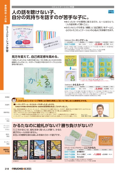 コミュニケーション学習人の話を聴けない子、自分の気持ちを話すのが苦手な子に。対象年齢6歳以上●めくったカードの質問に答えるだけ。ルールはひとつ、『人の話を黙って聴くこと』。●カウンセリングの手法『傾聴』と『自己開示』をゲームに。心ひらいたコミュニケーションの心地よさを体験できます。[tobiraco]トーキングゲームお申込番号8-617-5390商品種別型式/16004M価税抜オープン税抜価格¥2,500税込価格¥2,750単位1セット●寸法/外箱:87(幅)×108(奥)×19(高)mm、カード:50(縦)×80(横)mm●対象年齢/6歳以上●人数/2名から6名程度●包装数:1〈セット内容〉質問カード64枚、ブランクカード10枚、パスカード12枚、説明書〈元筑波大学附属大塚特別支援学校支援部長安部博志先生ご考案〉見方を変えて、自己肯定感を高める。『失敗してしまったね』も見方を変えると『次に失敗しないための大切な経験をしたんだね!』に。ネガティブな見方や考えをポジティブにとらえる思考が育ちます。裏返すと※ウォールポケットは、子供が手に取れる位置に掛けておき、いつも言われて気になる言葉を子供自身が裏返せるようにしてください。使用例[tobiraco]かえるカードお申込番号8-617-5391商品種別型式/16005M価税抜オープン税抜価格¥3,900税込価格¥4,290単位1セット●寸法/パッケージ:185(幅)×360(奥)×55(高)mm、カード:90(縦)×100横)mm、ウォールポケット:500(縦)×350(横)mm●材質/カード:紙、ウォールポケット:塩化ビニル●包装数:1〈セット内容〉テキストカード45枚、ブランクカード5枚、専用ウォールポケット1枚〈元筑波大学附属大塚特別支援学校支援部長安部博志先生ご考案〉これからのインクルーシブ教育には『柔軟な発想』と『互いを了解し合える関係性』が大切。■トーキングゲーム・かえるカードを作ったきっかけを、元筑波大学附属大塚特別支援学校支援部長安部博志先生にうかがいました。部博志先生安私は、特別支援教育コーディネーターとして、1万以上のクラスを観てきました。その中で、障害のある子が適応できているクラスには共通点があることに気づきました。その共通点とは、柔軟な発想』と『互いを了解し合える関係性』です。さらに、そのクラスにはいじめや不登校が極端に少ないことにも驚きました。インクルーシブ教育や共生社会を実現するヒントがここにあります。これが、この教材を作ろうとした動機です。トーキングゲーム・かえるカードを多様性を認め合う温かな学級づくりのために活用していただけたら嬉しいです。かるたなのに絵札がない!?勝ち負けがない!?「こころかるた」は、絵札を多く取った人が勝つ、かるた遊びのルールはありません。お互いの理解を深める楽しみを味わうカード遊びです。事務用品・その他コミュニケーション学習保健室保健室洗面所洗面所清掃用品清掃用トイレトイレ用品用品ティッシュテペーパー・ペーパー・タオルタオル飲料・飲料食品食キッチンキッチン用品用品事務用品・その他[クリエーションアカデミー]こころかるたお申込番号8-617-53838-617-53848-617-5385商品種別M価税抜税抜価格税込価格単位全年齢向けティーン向け¥1,980¥1,880¥2,0681セット子ども向け●寸法/124幅)×93奥)×20高)mm●包装数:1〈セット内容〉質問カード90枚、まごころカード18枚、説明書全年齢向けティーン向け子ども向け2182021