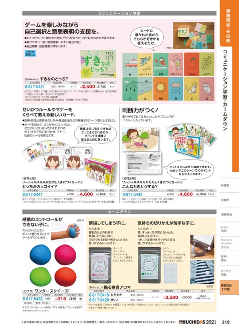 事務用品・その他コミュニケーション学習・カームダウン保健室室洗面所洗面所清掃用品トイレトイレ用品ティッシュッペーパー・ペーパー・タオルタオル飲料・食品キッチンキッチン用品用品事務用品・その他コミュニケーション学習ゲームを楽しみながら自己選択と意思表明の支援を。●めくったカードに描かれた絵のどちらが好きか、なぜ好きなのかを答えます。●選びやすい二択、意思表明しやすい身近な絵。●自己理解、他者理解が深まります。対象年齢3歳以上[tobiraco]すきなのどっち?お申込番号8-617-5421商品種別型式/18018M価税抜オープン税抜価格税込価格¥2,500¥2,750単位1セット●寸法/外箱:113幅)×92(奥)×26(高)mm、カード:86(縦)×108(横)mm●対象年齢/3歳以上●人数/2名から●包装数:1〈セット内容〉カード47枚、解説書〈筑波大学附属大塚特別支援学校教諭佐藤義竹先生ご考案〉せいかつルールやマナーをくらべて教える新しいカード。●食事・排泄と清潔・身だしなみ・集団生活などの場面を52シーン取り上げました。●カードを見せて、どこがかっこいいのか、裏面は何に気をつければかっこよくなれるのか、どこがかっこわるいのかそれぞれのポイントを子供に気づかせ、マナー、社会のルールを教えます。ポイントを明確に伝えるために使います。カードに描かれた絵からどちらが好きかを答えるだけ。使用例判断力がつく!家や学校でおこるちょっとしたハプニングが110シーン入っています。[合同出版]ソーシャルスキルがたのしく身につくカード①どっちがカッコイイ?[合同出版]ソーシャルスキルがたのしく身につくカード②こんなときどうする?お申込番号8-617-5441M価税抜¥4,600税抜価格¥4,600税込価格¥5,060単位1セットお申込番号8-617-5442M価税抜¥4,600税抜価格¥4,600税込価格¥5,060単位1セット●カード寸法/115(縦)×175(横)mm●包装数:1〈セット内容〉かっこいいカード×52枚、かっこわるいカード×52枚、白紙カード×6枚、説明書●カード寸法/115縦)×175横)mm●包装数:1〈セット内容〉どうするカード×110枚、説明書ヒントを出しながら質問できます。ねらいでこのシーンでのポイントをおさえられます。感情のコントロールができない子に。カッとなったときにギュッと握らせることでクールダウンします。カームダウン使用例緊張してしまう子に。気持ちの切りかえが苦手な子に。たとえば・・・運動会などの行事で緊張しそうなときに。「おだやか」は気分をほっとさせる香りがするシールです。たとえば・・・朝、すっきり目が覚めないとき、集中したいときに。「きりり」は気分をすっきりさせる香りがするシールです。オレンジ、ラベンダー、ティートリーをブレンドした精油をしみこませています。レモン、ペパーミント、ユーカリ、メイチャンをブレンドした精油をしみこませています。[tobiraco]貼る療育アロマ使用例お申込番号8-617-54198-617-5420きりりおだやか商品種別M価税抜税抜価格税込価格単位型式/18016型式/18017オープン¥3,500¥3,85030枚入(6枚×5シート)●シール直径/29mm●質量/17g●材質/不織布(レーヨン)、PET、アクリル系粘着剤●包装数:1※乳児への使用は避けてください。[カワダ]ワンダースクイーズ!お申込番号8-617-5433M価税抜¥350商品種別型式/VR-001税抜価格¥315税込価格単位¥3461個●寸法/60(径)mm●材質/TPR●質量/37g●包装数:1※色は4色のいずれかになります。※表示価格は税込・税抜価格どちらも掲載しております。税抜価格を一番太い赤文字で、税込価格は消費税率10%として表示しております。2021219