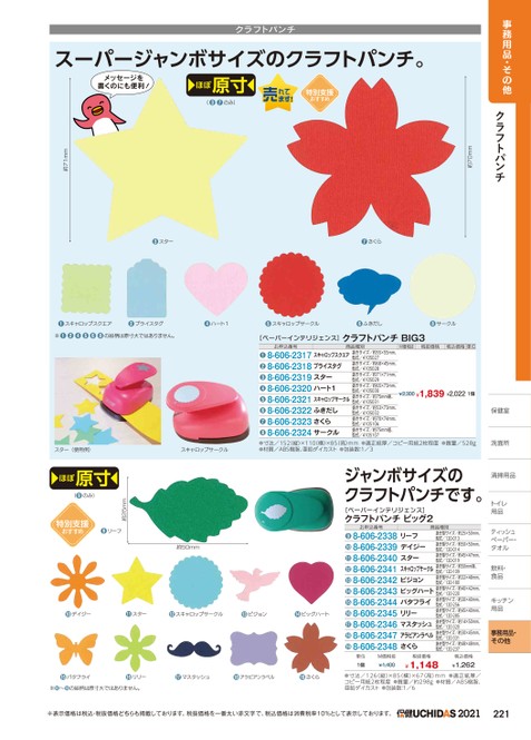 事務用品・その他クラフトパンチ約70mmスーパージャンボサイズのクラフトパンチ。クラフトパンチほぼ原寸(●●のみ)メッセージを書くのにも便利!約71mm●スター●さくら●スキャロップスクエア●プライスタグ●ハート1●スキャロップサークル●ふきだし●サークル※●●●●●●の絵柄は原寸大ではありません。[ペーパーインテリジェンス]クラフトパンチBIG3M価税抜税抜価格税込価格単位¥2,300¥1,839¥2,0221個抜きサイズ/約55×55mm、型式/4105027抜きサイズ/約68×45mm、型式/4105028抜きサイズ/約71×71mm、型式/4105029抜きサイズ/約65×73mm、型式/4105030抜きサイズ/約75mm径、型式/4105031抜きサイズ/約53×73mm、型式/4105032抜きサイズ/約70×74mm、型式/4105106抜きサイズ/約75mm径、型式/41051078-606-2317スキャロップスクエア8-606-2318プライスタグ8-606-2319スター8-606-2320ハート18-606-2321スキャロップサークル8-606-2322ふきだし8-606-2323さくら8-606-2324サークル●●●●●●●●お申込番号商品種別スター(使用例)スキャロップサークル●寸法/152(縦)×110(横)×85(高)mm●適正紙厚/コピー用紙2枚程度●質量/528g●材質/ABS樹脂、亜鉛ダイカスト●包装数:1/3保健室室洗面所洗面所清掃用品トイレトイレ用品ティッシュッペーパー・ペーパー・タオルタオル飲料・食品キッチンキッチン用品用品事務用品・その他ジャンボサイズのクラフトパンチです。お申込番号商品種別デイジースキャロップサークル抜き型サイズ/約25×50mm、型式/120-013抜き型サイズ/約50×50mm、型式/120-014抜き型サイズ/約45×47mm、型式/120-019抜き型サイズ/約50mm径、型式/120-109抜き型サイズ/約32×48mm、型式/120-1808-606-2338リーフ8-606-23398-606-2340スター8-606-23418-606-2342ピジョン8-606-2343ビッグハート抜き型サイズ/約40×42mm、8-606-23448-606-2345リリー8-606-23468-606-23478-606-2348さくら型式/120-220抜き型サイズ/約30×40mm、型式/120-256抜き型サイズ/約45×40mm、型式/120-285抜き型サイズ/約14×50mm、型式/120-320抜き型サイズ/約30×45mm、型式/120-331抜き型サイズ/約48×48mm、型式/120-237マスタッシュアラビアンラベルバタフライ●●●●●●●●●●●[ペーパーインテリジェンス]クラフトパンチビッグ2●デイジー●スター●スキャロップサークル●ピジョン●ビッグハート約50mm●リーフ約25mmほぼ原寸(❾のみ)●バタフライ●リリー●マスタッシュ●アラビアンラベル●さくら※❿〜⓳の絵柄は原寸大ではありません。単位1個M価税抜¥1,400税抜価格¥1,148税込価格¥1,262●寸法/126(縦)×85(横)×67(高)mm●適正紙厚/コピー用紙2枚程度●質量/約298g●材質/ABS樹脂、亜鉛ダイカスト●包装数:1/6※表示価格は税込・税抜価格どちらも掲載しております。税抜価格を一番太い赤文字で、税込価格は消費税率10%として表示しております。2021221