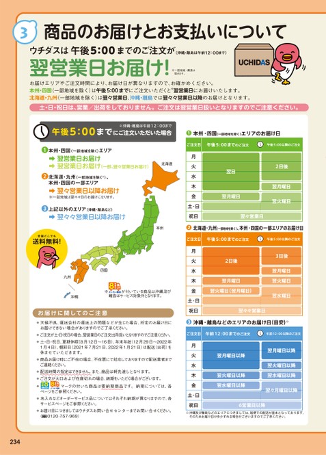 3商品のお届けとお支払いについてウチダスは午後5:00までのご注文が翌営業日お届け!※一部地域・離島は除きます。(沖縄・離島は午前12:00まで)お届けエリアやご注文時間により、お届け日が異なりますので、お確かめください。本州・四国(一部地域を除く)は午後5:00までにご注文いただくと※翌営業日にお届けいたします。北海道・九州(一部地域を除く)は翌々営業日、沖縄・離島では翌々々営業日以降のお届けとなります。土・日・祝日は、営業/出荷をしておりません。ご注文は翌営業日扱いとなりますのでご注意ください。午後5:00までにご注文いただいた場合※沖縄・離島は午前12:00まで❶本州・四国(一部地域を除く)エリア➡翌営業日お届け➡翌営業日お届け(一部、翌々営業日お届け)北海道❷北海道・九州(一部地域を除く※)、本州・四国の一部エリア➡翌々営業日以降お届け※一部地域は翌々々日のお届けになります。❸上記以外のエリア(沖縄・離島など)➡翌々々営業日以降お届け全国どこでも送料無料!四国九州沖縄※が付いている商品は沖縄及び離島はサービス対象外となります。お届けに関してのご注意●天候不良、運送会社の運送上の問題などが生じた場合、所定のお届け日にお届けできない場合がありますのでご了承ください。●ご注文が土・日・祝日の場合、翌営業日のご注文出荷扱いとなりますのでご注意ください。●土・日・祝日、夏期休暇(8月12日〜16日)、年末年始(12月29日〜2022年1月4日)、棚卸日(2021年7月21日、2022年1月21日)は配送(出荷)を休ませていただきます。●商品お届け時にご不在の場合、不在票にて対応しておりますので配送業者までご連絡ください。●配送時間の指定はできません。また、商品は軒先渡しとなります。●ご注文が大口および在庫切れの場合、納期をいただく場合がございます。●●マークの付いた商品は要納期商品です。納期については、各ページをご参照ください。名入れなどオーダーサービス品についてはそれぞれ納期が異なりますので、各サービスページをご参照ください。●お届け日につきましてはウチダスお問い合せセンターまでお問い合せください。(0120-757-969)234❶本州・四国(一部地域を除く)エリアのお届け日ご注文日午後5:00までのご注文午後5:00以降のご注文月火水木金土・日祝日2日後翌月曜日翌火曜日翌日翌月曜日翌々営業日本州❷北海道・九州(一部地域を除く)、本州・四国の一部エリアのお届け日ご注文日午後5:00までのご注文午後5:00以降のご注文月火水木金土・日祝日2日後翌月曜日翌火曜日(翌月曜日)3日後翌月曜日翌火曜日翌水曜日翌々々営業日❸沖縄・離島などのエリアのお届け日(目安)※ご注文日午前12:00までのご注文午前12:00以降のご注文月火水木金土・日祝日翌月曜日以降翌火曜日以降翌水曜日以降翌月曜日以降翌火曜日以降翌水曜日以降翌々月曜日以降6営業日以降※沖縄及び離島などのエリアにつきましては、船便での配送が基本となっております。そのためお届け日が多少ずれる場合がございますのでご了承ください。