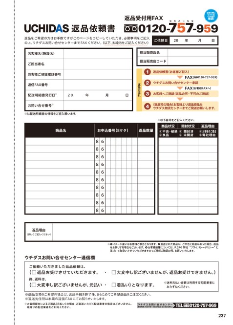 返品依頼書返品受付用FAX70120-7ななーご確認!57-959送信の前にもう一度FAX番号なな商品名お申込番号(8ケタ)返品数量※以下番号をご記入ください。商品状況①不良・破損②良品開封状況①開封済②未開封返品理由①お客様のご都合②弊社理由返品をご希望の方はお手数ですがこのページをコピーしていただき、必要事項をご記入の上、ウチダスお問い合せセンターまでFAXください。(以下、太線内をご記入ください)ご依頼日20年月日返品依頼書(お客様ご記入)FAX(70120-757-959)ウチダスお問い合せセンター承認FAX(お客様FAXへ)お客様へご連絡(返品の可・不可のご連絡)(返品可の場合)お客様より返品商品をウチダス物流センターまでご発送お願いします。1234返品の流れ担当販売店名担当販売店コードお客様名(施設名)ご担当者名お客様ご登録電話番号返信FAX番号配送明細書発行日※20年月日お問い合せ番号※※は配送明細書の情報をご記入願います。88888888886666666666返品理由(詳しくご記入ください)ウチダスお問い合せセンター通信欄ご依頼いただきました返品依頼は、※❶イメージ違いはお客様ご都合となります。❷返送された商品が、ご申告と相違があった場合、返品をお断りする場合もございます。❸お客様情報については、P.240弊社“プライバシーポリシー”に基づいて取扱いさせていただきますのでご理解ご確認の程、お願いいたします。(□返品お受けさせていただきます。・□大変申し訳ございませんが、返品お受けできません。)尚、送料は、(□大変申し訳ございませんが、元払い・□着払い)となります。※送料元払い金額は利用する宅配業者におたずねください。※商品交換をご希望の場合は、返品手続き終了後、あらためてご希望商品をご注文ください。※返送先住所は本票の返信FAXにてお知らせいたします。※お客様都合によるご返品(元払い)の場合、ご返送いただく配送業者の指定はございません。最寄りの配送業者をご利用ください。ウチダスお問い合せセンター受付時間:午前9時〜午後5時(土・日・祝日を除く)TEL70120-757-969237