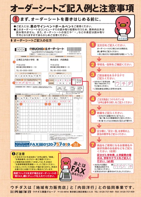 オーダーシートご記入例と注意事項!まず、オーダーシートを書きはじめる前に。●ご記入には、黒のサインペンやボールペンをご使用ください。●このオーダーシートはコンピュータでの読み取り処理を行うため、黒枠内以外は読み取れません。また、オーダーシートの加工や「〃」などの表記は読み取り不可となりますのであらかじめご注意ください。123オーダーシート注文日をご記入ください。オーダーシートが2枚にわたる場合は、通し番号をご記入ください。*例:2枚のうち1枚目を表現する場合→「1/2」学校名・住所をご確認ください。ご担当者名をカ・・・・ご記入ください。タカナで*カタカナ7文字以内(濁点・半濁点は同じマス)でご記入ください。例*ご担当者名は荷札に印字されます。4567ご注文商品につけられている「お申込番号(8桁)」をご記入ください。数量をご記入ください。*カタログに記載されている「セット」「組」「個」などの数量単位でご記入ください。*枚・個・セットなどの単位のご記入は不要です。区分欄に、区分一覧」を参照の上、該当の数字をご記入ください。商品をご使用になるお客様名や請求先様のお名前などをご記入ください。(任意)区分が3.学年費、4.学級費の場合は、学年やクラスをご記入ください。(必須)*カタカナの濁点・例半濁点は別のマスにご記入ください。*文字はカタカナ、数字のみで入力してください。ご請求区分一覧1:公費2:個人3:学年費(※)4:学級費(※)5:PTA会費6:児童会費7:生徒会費8:園費・校費9:その他※3・4学年やクラスの場合は必ずご発注担当者欄にご記入くださいますようお願いします。ご発注担当者(カタカナ・英・数10文字)※任意備考欄お客様控え欄としてお使いください。弊社での内容確認はいたしません。お客様控え7区分6UCHIDASウチダス)システムでのご注文に関して■コンピュータで読み取っているため、オーダーシートの加工はしないでください。また「〃」などの表記も不可といたします。■時間指定、土・日・祝日のお届けは行っておりません。土・日・祝日の営業は行っておりません。)■ご注文締め切り時間につきましてはカタログまたはインターネットショップをご覧ください。■ご請求関連につきましては、担当販売店とご相談ください。⬇オーダーシートご記入の仕方オーダーシートコンピュータで自動で読み取りますので、記入例に従って枠内に、はっきりとご記入ください。ご登録内容に変更のある方はP.238の「お客様情報変更連絡シート」をご利用ください。2021*お手数ですがコピーをとってご使用ください#1000009001-0001-Aお客様情報※ご登録住所以外にはお届けできません。!担当販売店情報※ご請求担当の販売店です。!江東区立内田小学校様株式会社内田商店2〒135-8730東京都江東区東陽10ー10TEL:00ー0000ー0000〒135-8730東京都江東区東陽10ー9TEL:00ー0000ー0000★ユーザーコード(お届け先コード)★新販売店コードご担当者名!※カタカナ7文字以内(濁点・半濁点は同じマス)でご記入ください。ご担当者名は荷札に印字されます。3様1ご注文日2200年520月日再FAX送信枚数1枚/全2枚※送信エラー等で同じ内容を再FAXする場合チェックをは、お願いします。お客様通信欄(ご意見・ご要望など)※お届け時間及び、ご登録住所以外の指定は承っておりません。※ご請求に関しては、担当販売店と直接ご相談お願いいたします。ご注文内容(ご記入には黒のサインペンやボールペンをご使用ください。)お申込番号数量(右詰)5-----------4-----------記入例12345678910承認印欄(回覧等でご自由にお使いください。)その他、何かご不明点ございましたら…ウチダスお問い合せセンター受付時間:午前9時〜午後5時(土・日・祝日を除く)TEL70120-757-969FAX70120-7な57-959ーなごななFAX番号はお間違えのないようお願いいたします。ご注文ありがとうございました。FAX送信方向!ご注意*ご注文のFAXを送る前に「お申込番号」「数量」「お電話番号」などもう一度ご確認ください。*ご登録内容の変更につきましては、P.238の「お客様情報変更連絡シート」にご記入ください。*ご記入いただいた内容に不備がありますと、所定のお届け日にお届けできない場合がございます。再度ファックスを流す場合はオーダーシートの「再FAX」欄にチェックを入れてください。オーダーシートあとはFAX送るだけ!ウチダスは「地域有力販売店」と「内田洋行」との協同事業です。ウチダス事業グループ〒135-0016東京都江東区東陽2-3-25TEL:0120-757-969FAX:0120-757-959